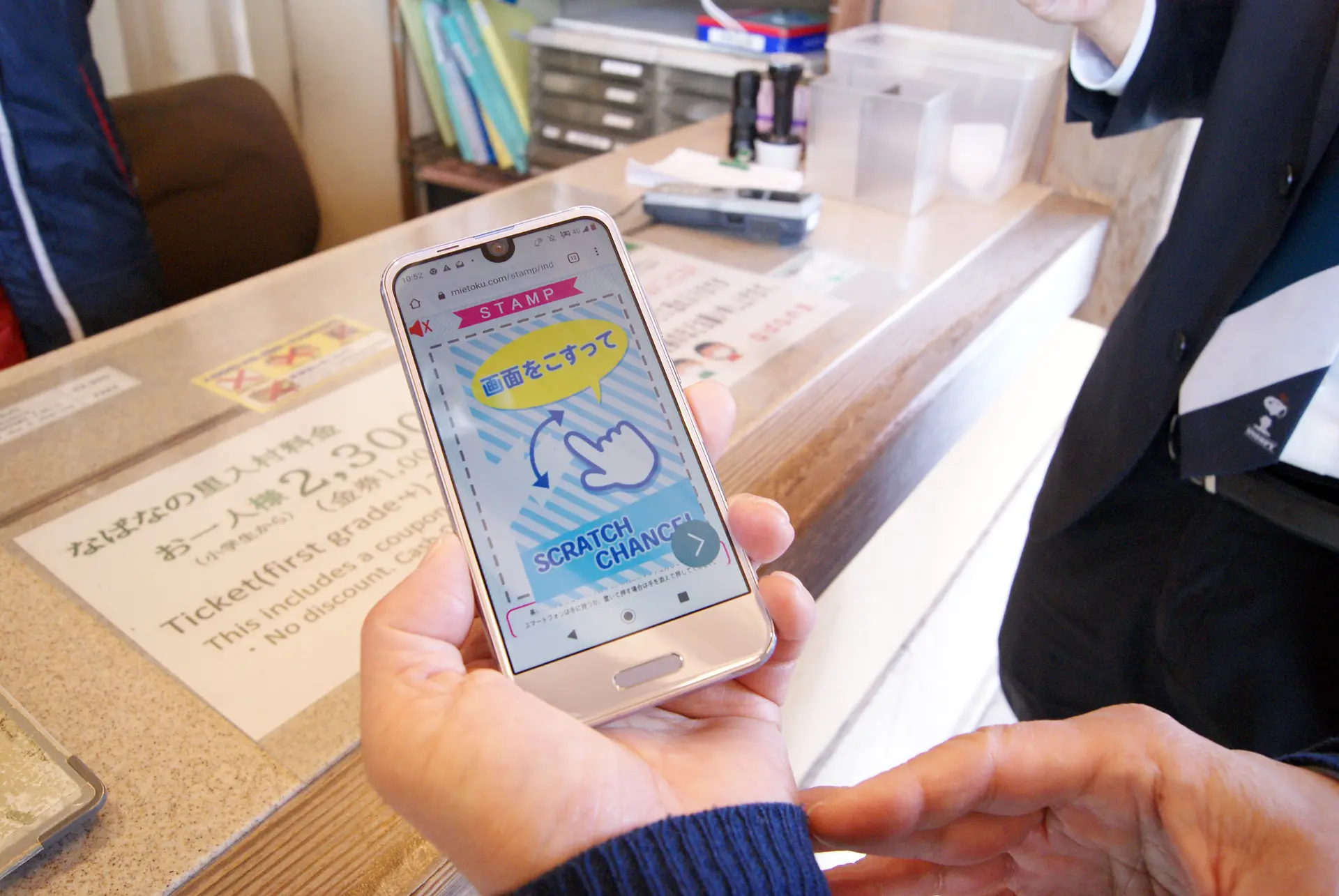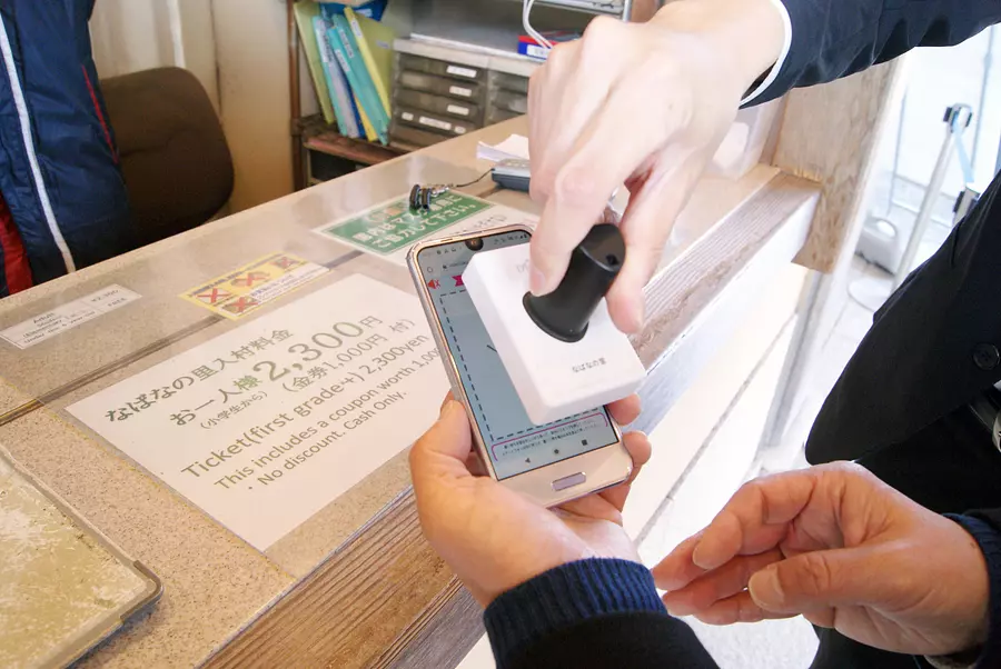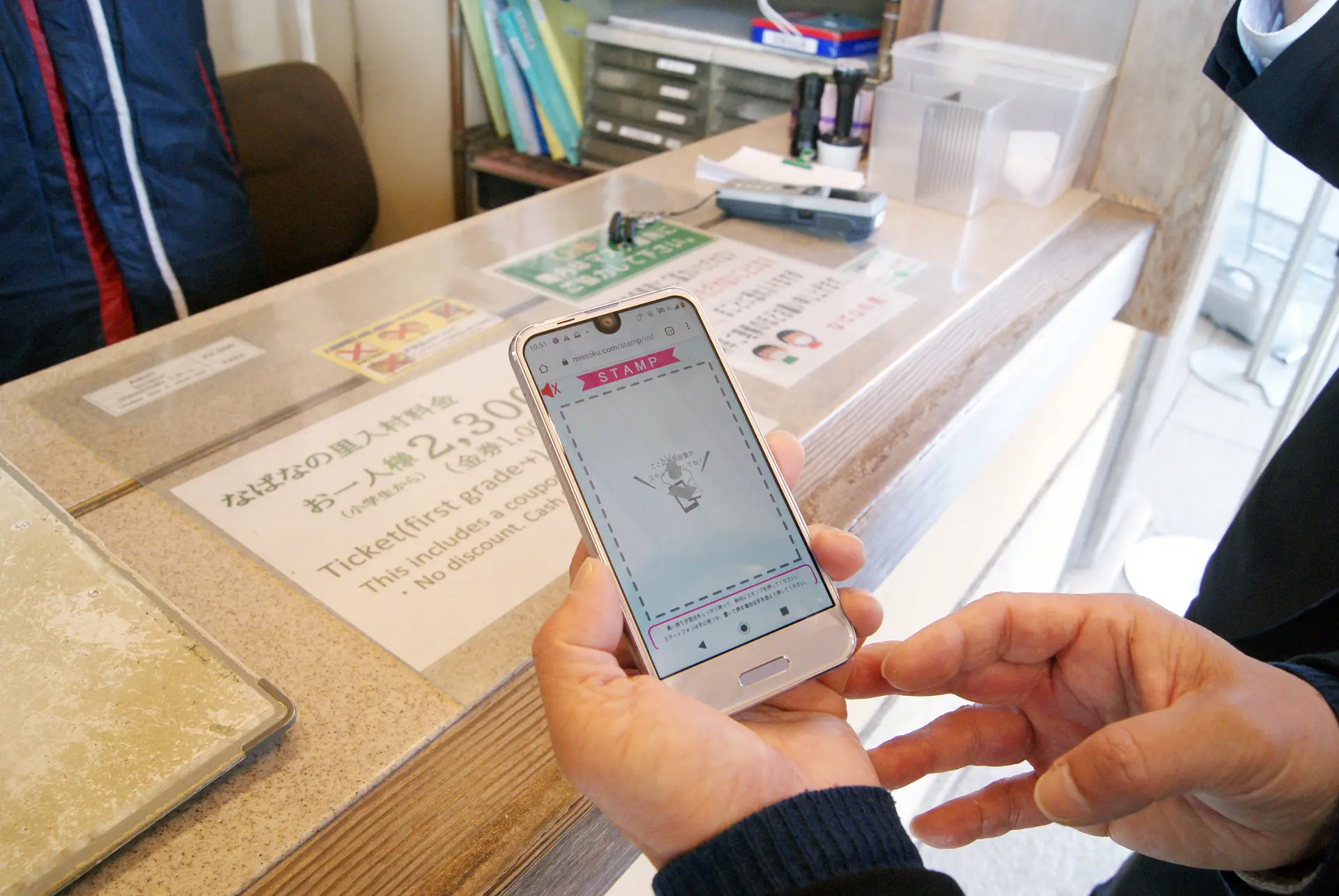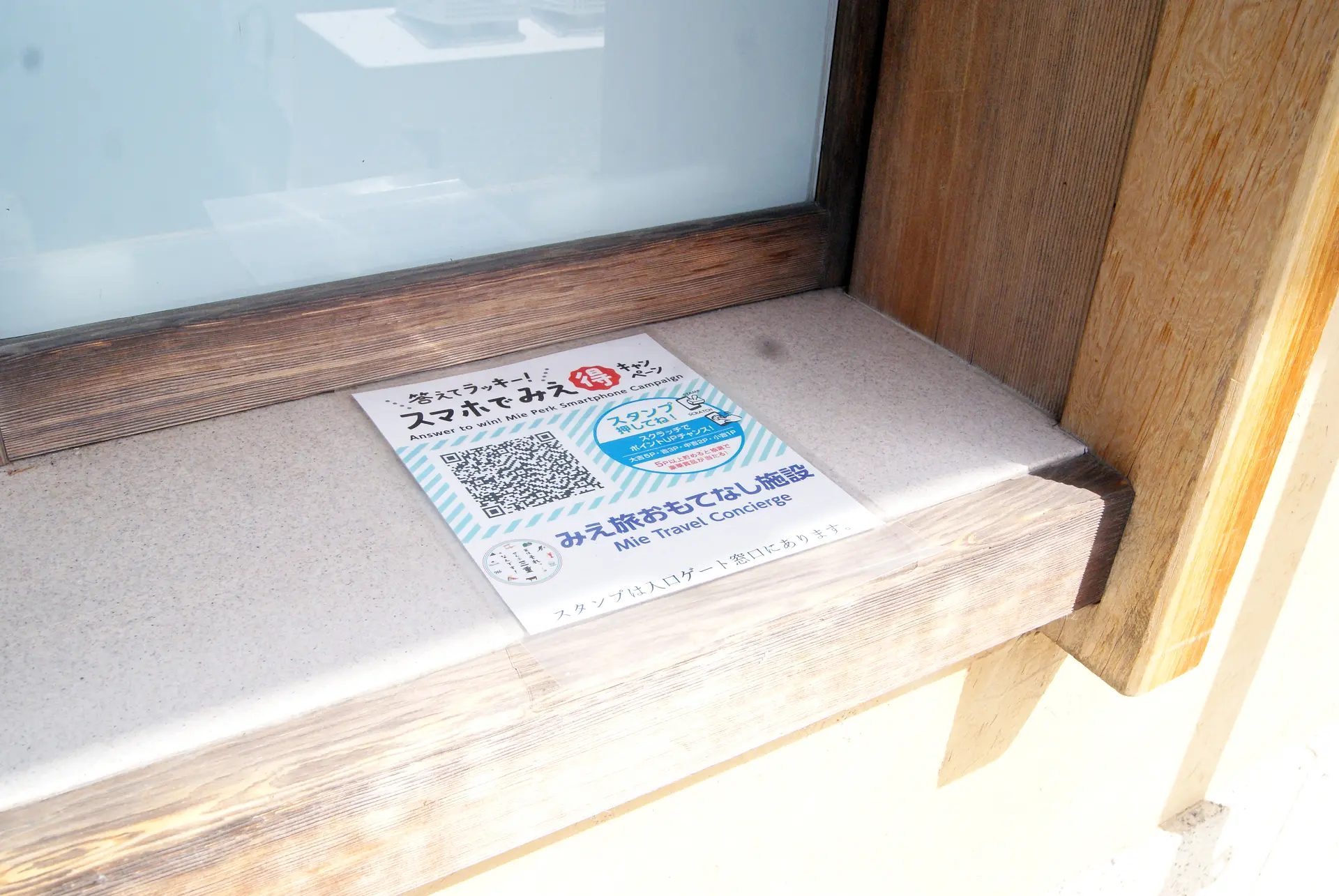 「みえ旅おもてなし施設」または「みえ旅案内所」を訪れたら、まず「答えてラッキー!スマホでみえ得キャンペーン」のステッカーを探しましょう。今回は、「みえ旅おもてなし施設」の「なばなの里」にやってきました。