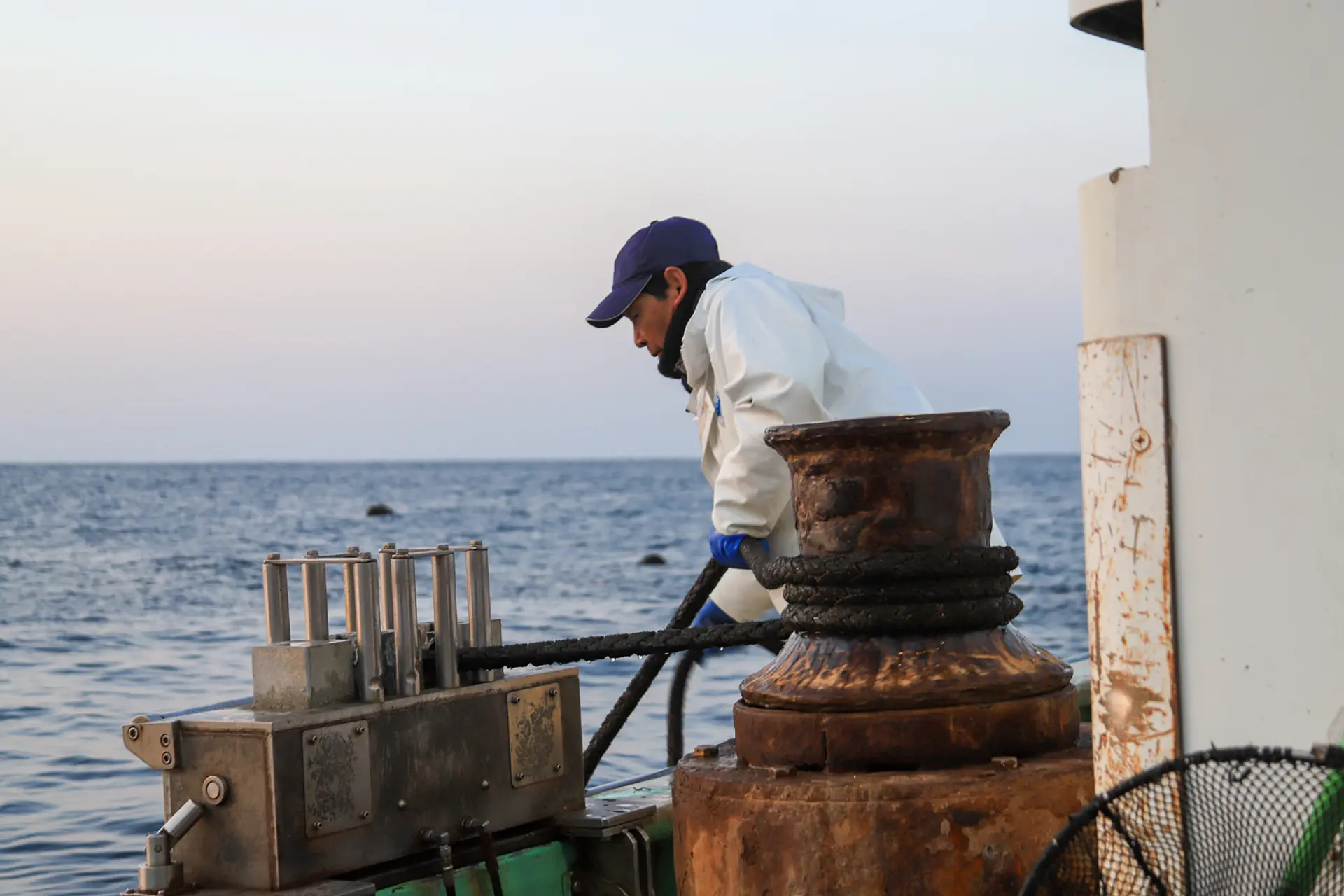 「はーい!」と連携する漁師さんの掛け声が船上に響き、手繰り寄せた網が再び海へと戻されていきます。網は汚れや補修、台風などの異常気象時など以外はマブリカ前に設置し続けます。