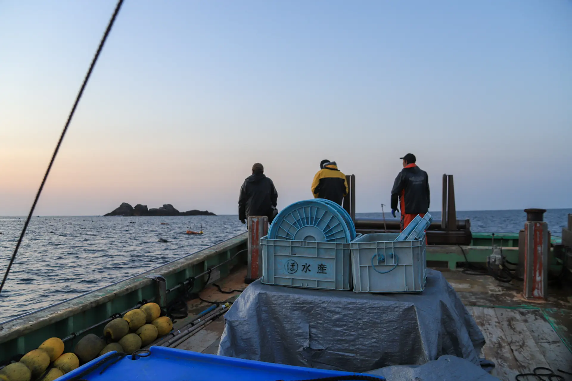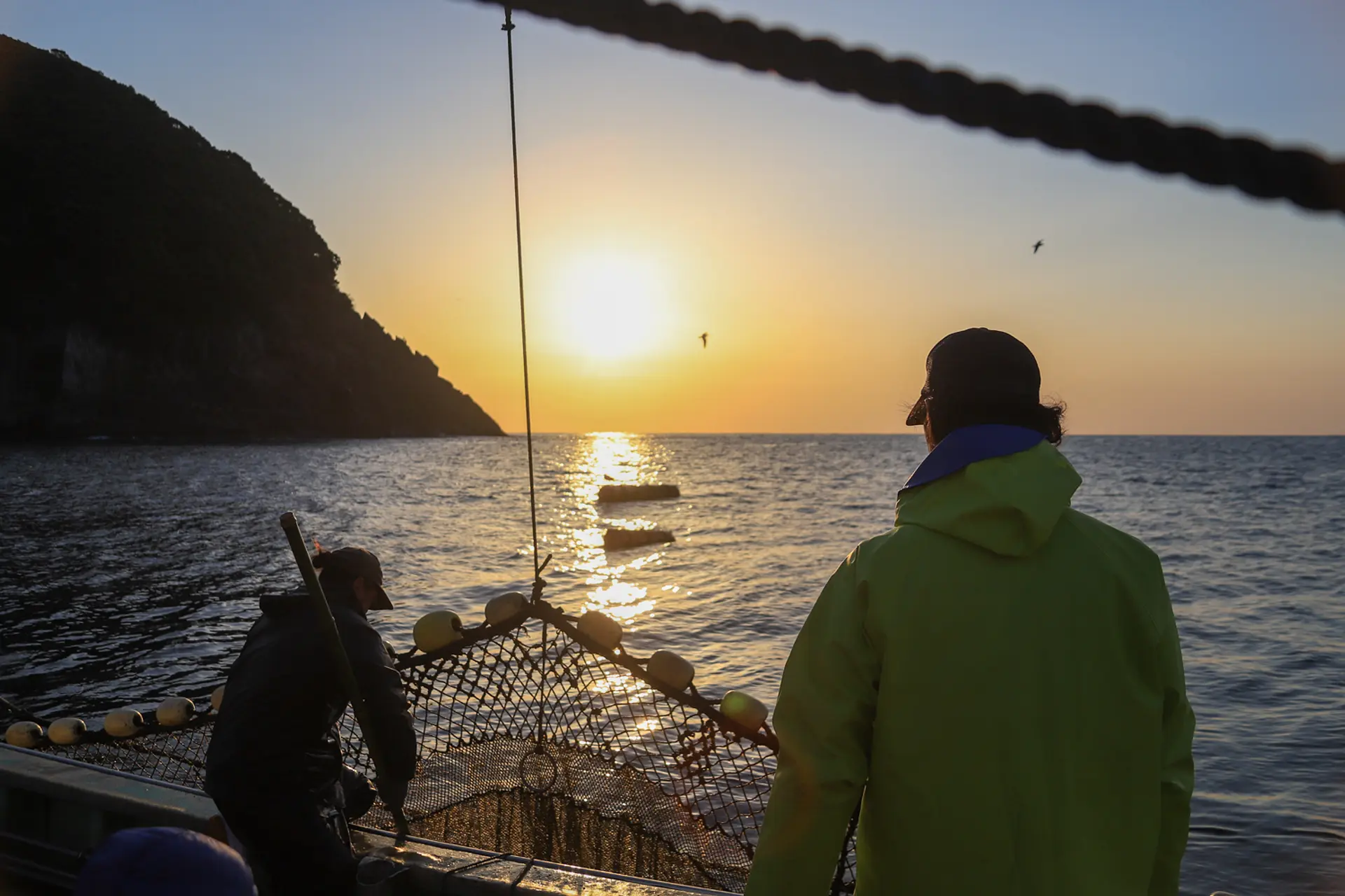 午前5時30分、辺りはまだ暗い中でゴォーというエンジン音と共に船から颯爽と現れた漁師さんたち。