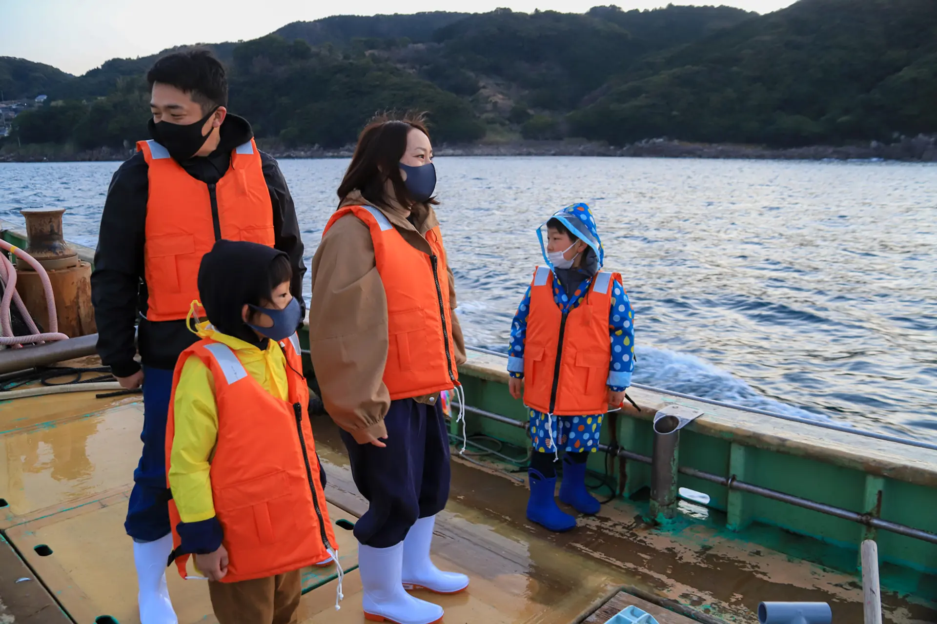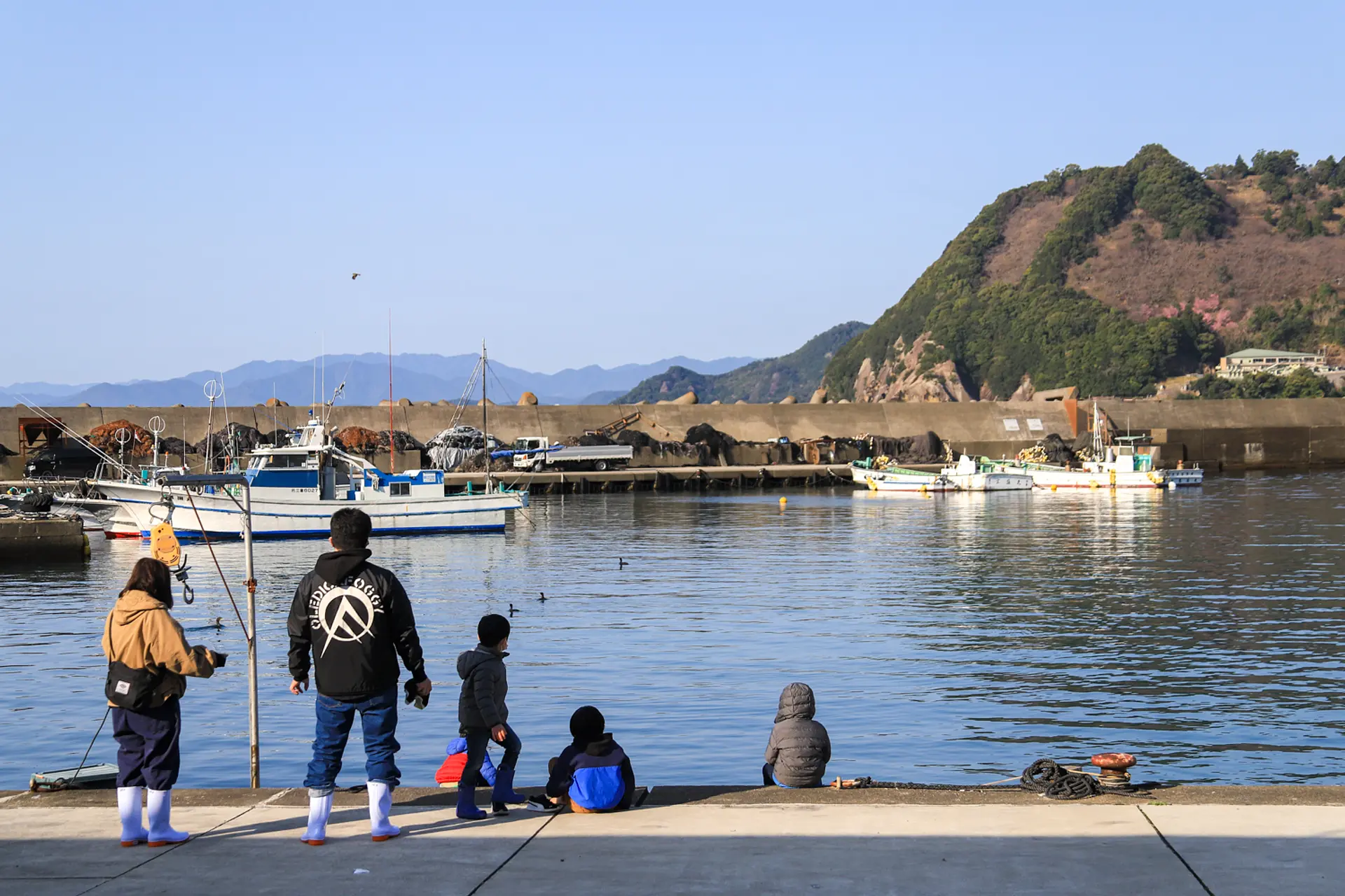 「熊野の海 観光定置網漁モニタリング(仮)」を体験するため、磯崎漁港(いそざきぎょこう)に集まった親子2組。