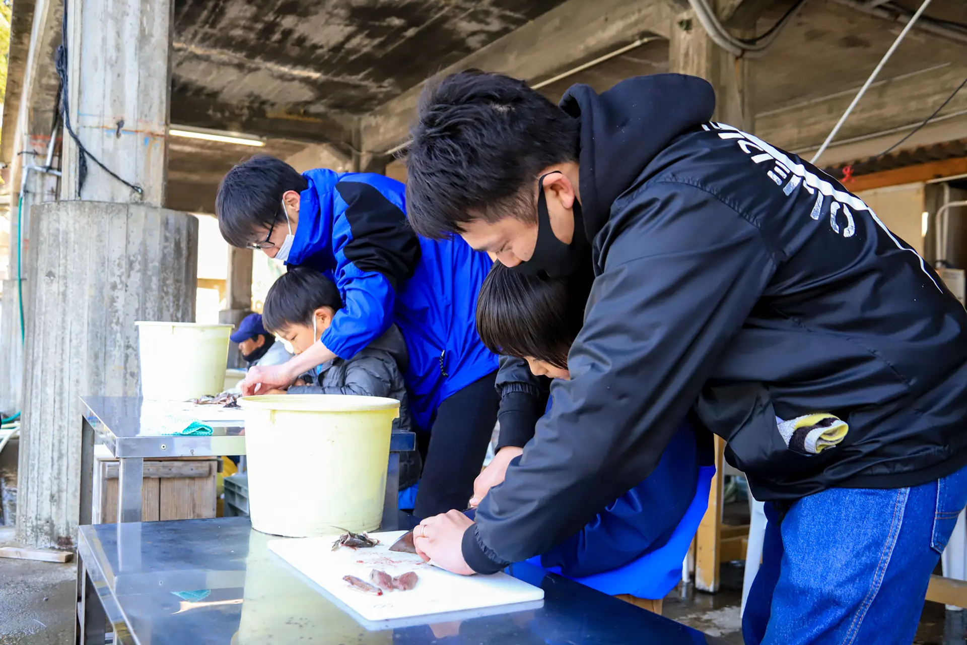 まずは漁師さんからしっかりと捌き方のレクチャーを受け、普段は全くお魚をさばかないというお父さんも真剣な表情です。