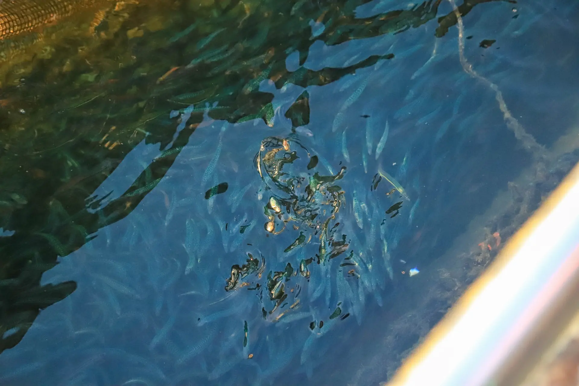 ー「忙しなく泳いでいるのは、カタクチイワシ。真ん中らへんでキラキラしとるのは、サバゴ(鯖の子ども)。」