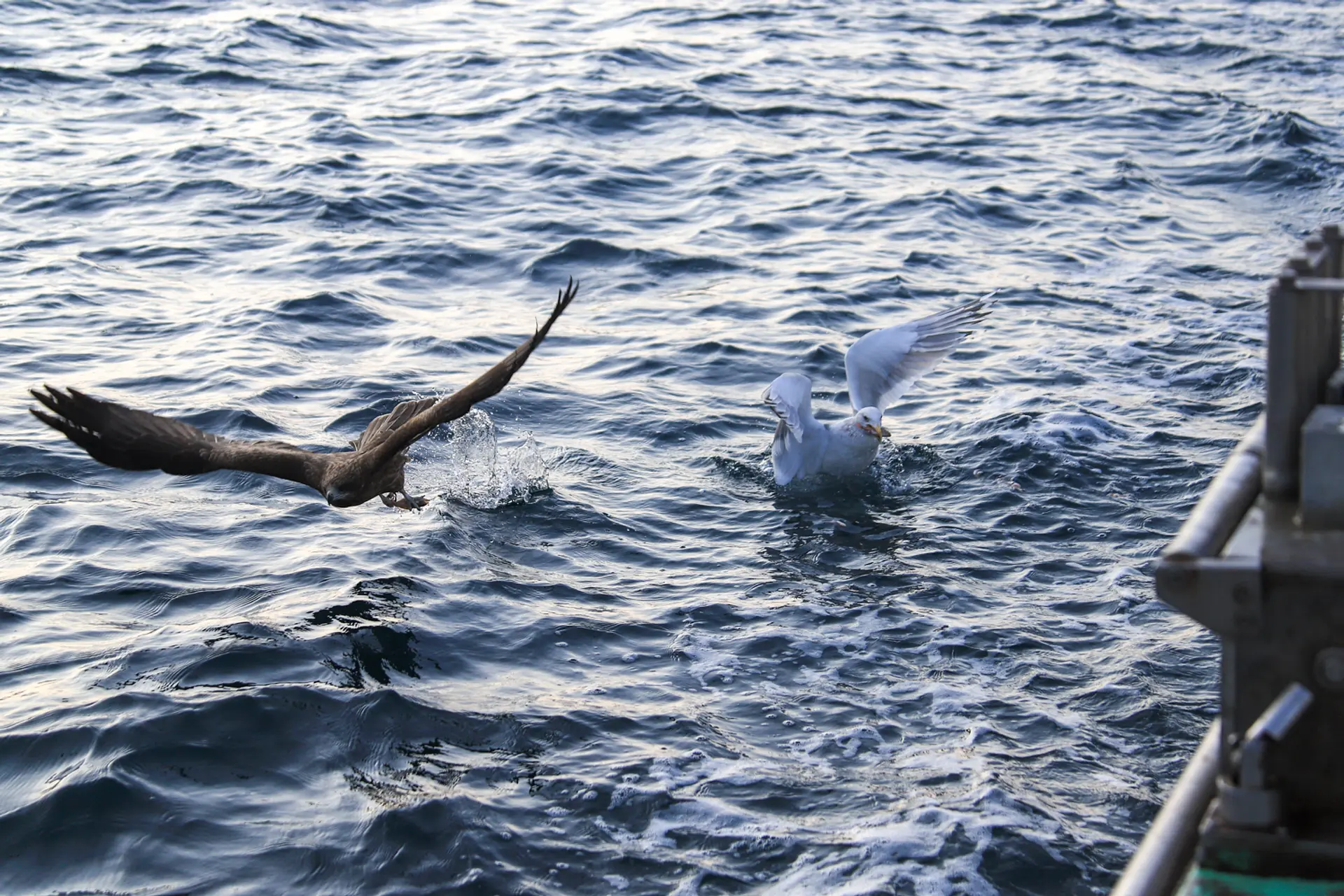 トンビは足でバッチリ小魚を掴み、ウミネコはパクっと口でキャッチする様子をばっちり間近で見ることができます。太陽を背にしてゆっくりと磯崎漁港へ向かう船をねぎらうような鳥たちの飛行は、まるでテーマパークのパレードのようです。