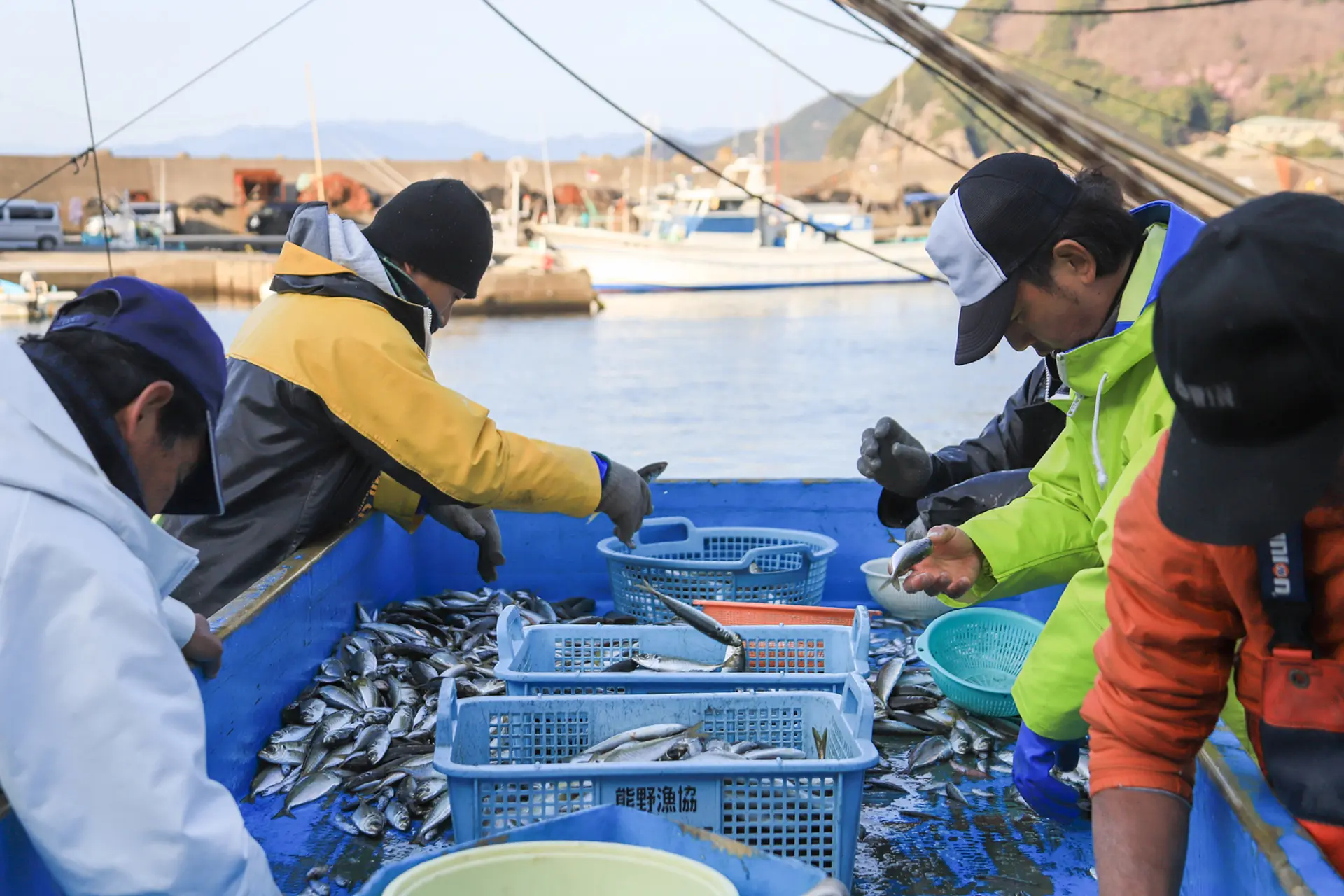 磯崎漁港に到着するとすぐに、漁師さん達は水揚げされたお魚を市場に運ぶ準備に取り掛かります。