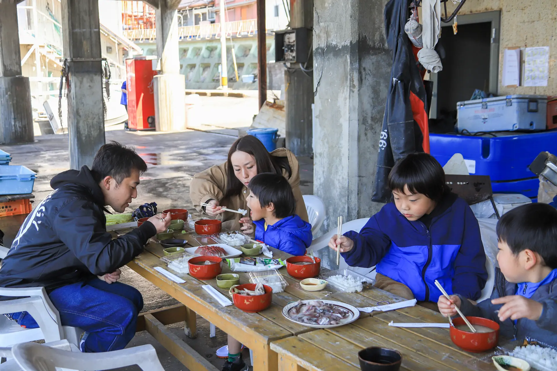 港に着けば、今度はお待ちかねの「漁師さんの朝ごはん」が待っています。