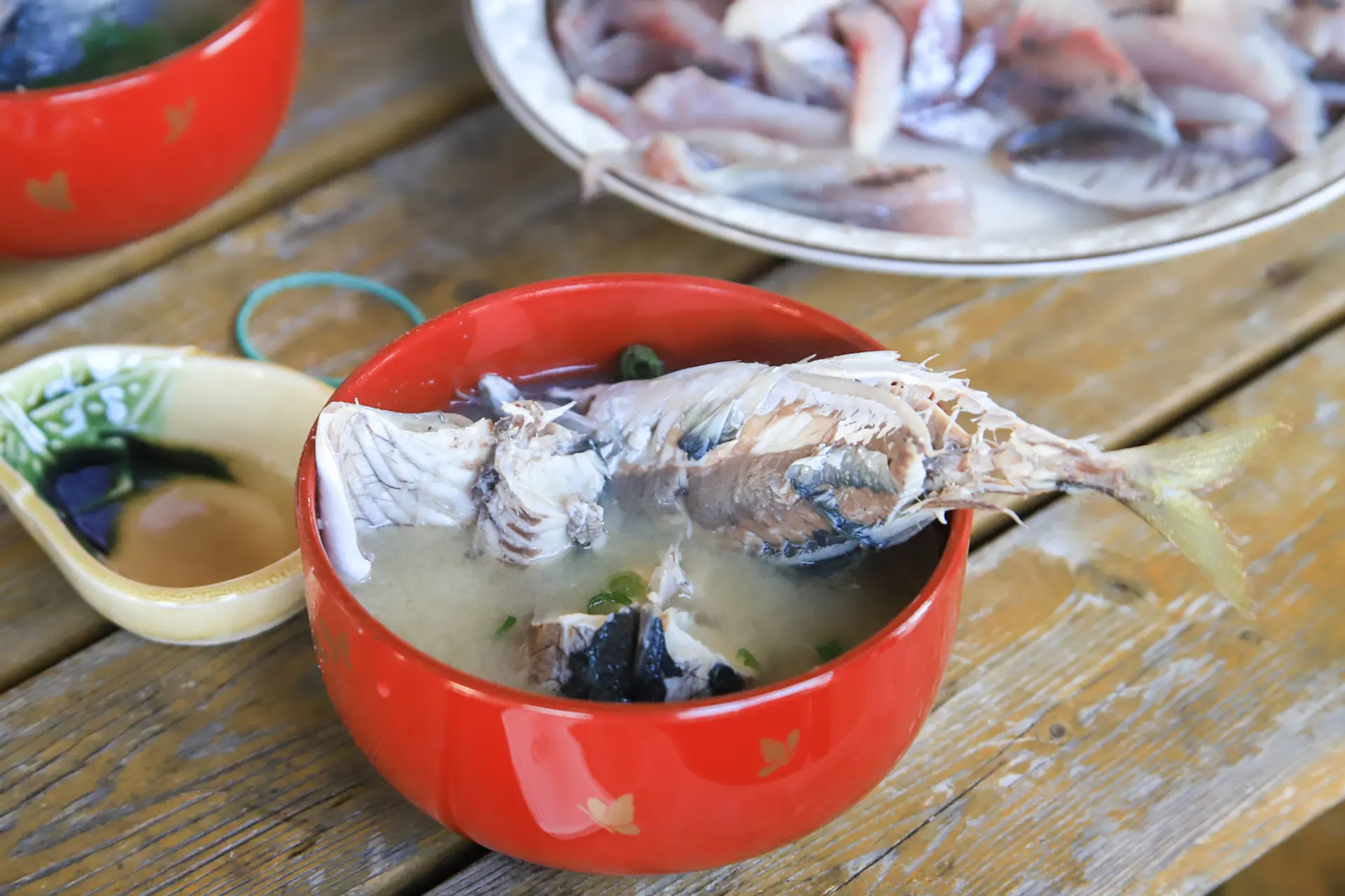 ワラサとアジのお造りに加えて、年中食べている漁師めし「魚汁(さかなじる)」も完成!