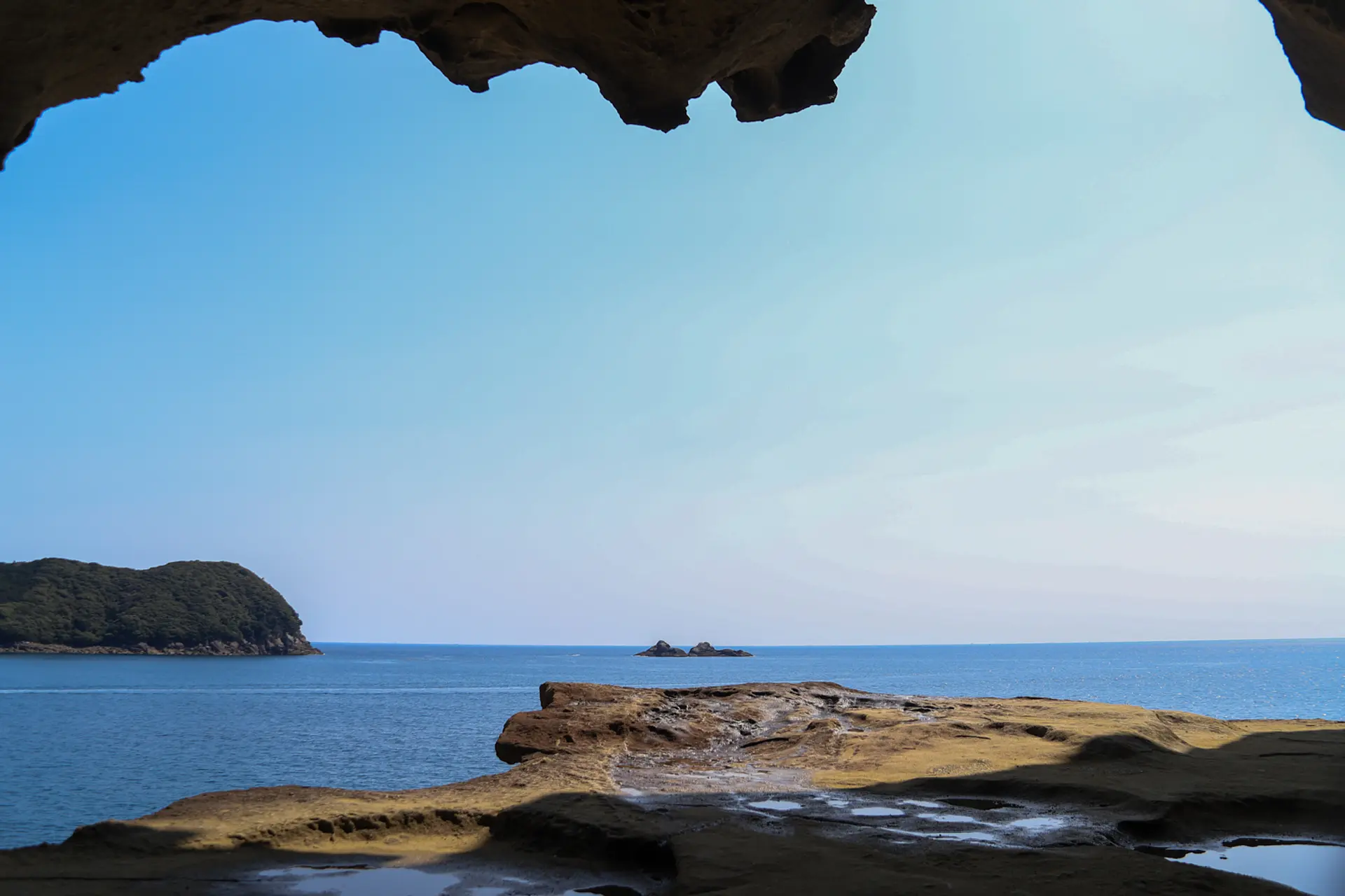 世界遺産『紀伊山地の霊場と参詣道』の一部で、荒波で削られた凝灰岩の大岸壁が圧巻で、磯崎漁港から車で6分です。魔見ヶ島や見学した定置網も鬼ヶ城から肉眼で確認できます。