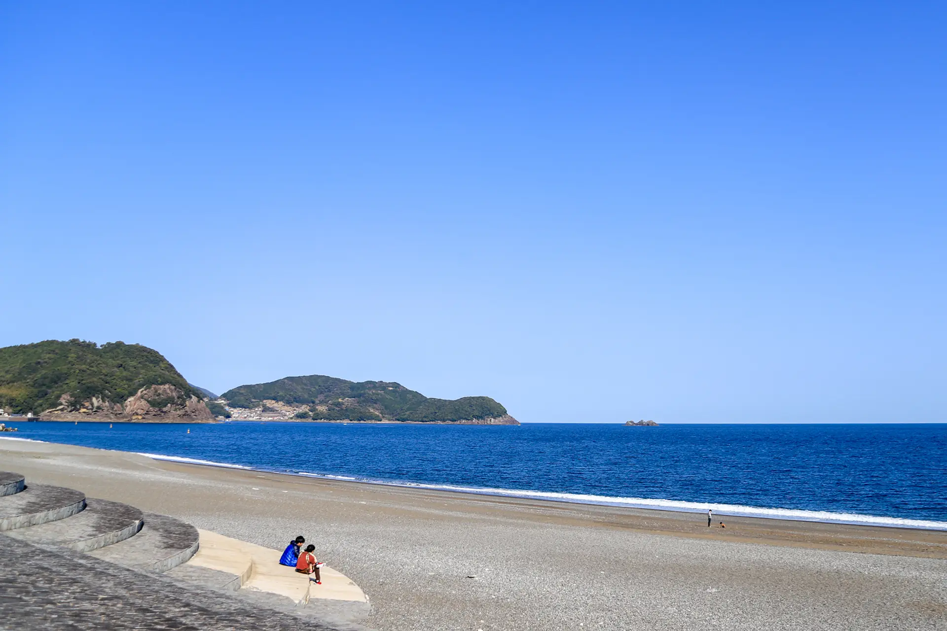 磯崎漁港が見える方向の反対側には、全長約22Kmの日本で一番長い砂礫海岸「七里御浜」の光景が広がっています。また、「鬼の見晴台」から石畳が美しい世界遺産 熊野古道「松本峠」にも徒歩約15分でアクセスできます。