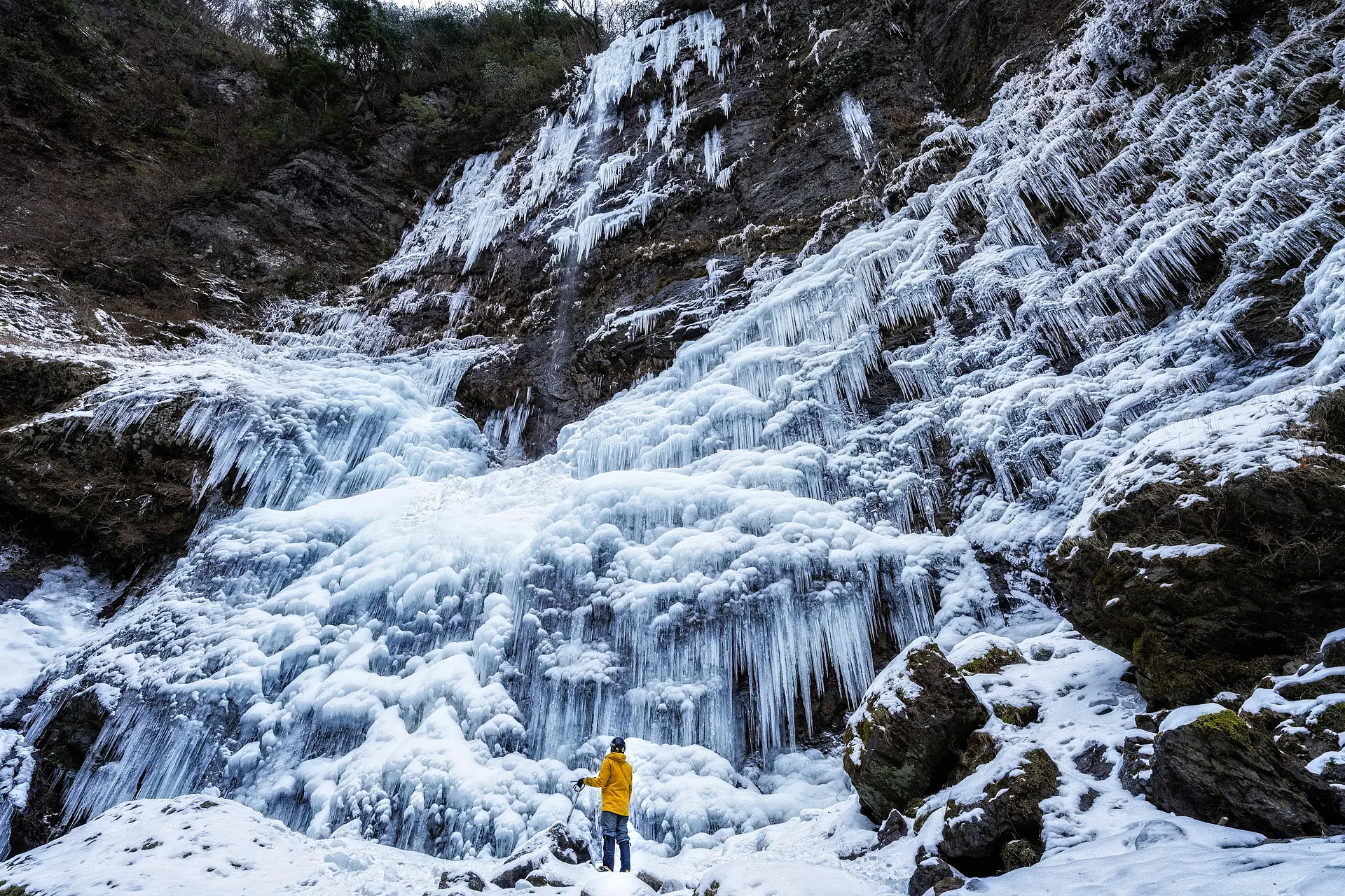 撮影者コメント:今冬は寒波が長引いたので、ずっと見たいと思っていた、風折の滝の氷瀑を撮影してきました。宮の谷渓谷は高滝と風折れ滝の分岐から先は、アクロバティックなコースになり、大変でしたが、最後の岩場を登り視界が開けると、ブルーアイスの氷瀑が天使の翼を広げてくれていました。