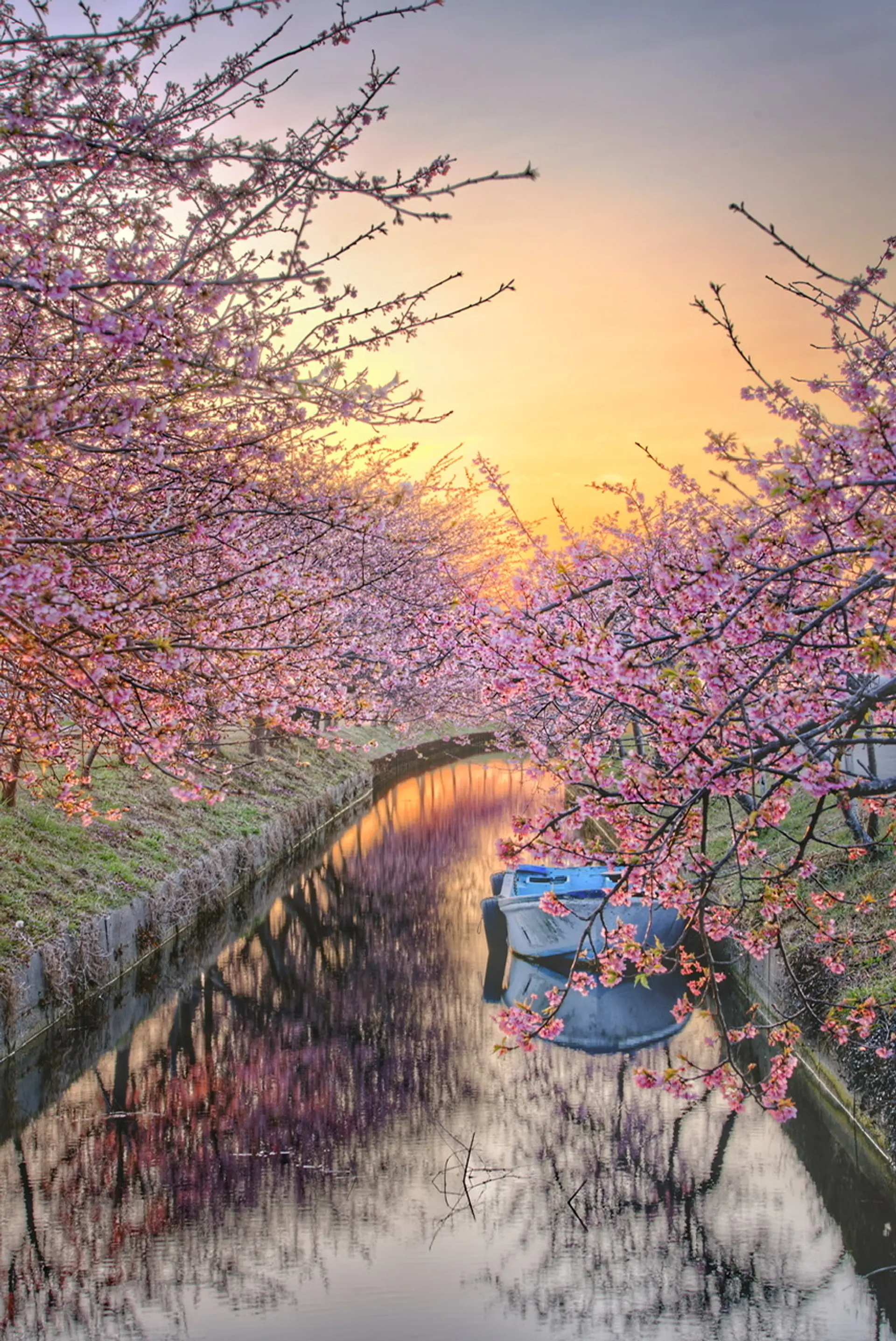 河津桜と船が水面に映っていて幻想的です。朝日の淡いグラデーションも美しい1枚ですね。
