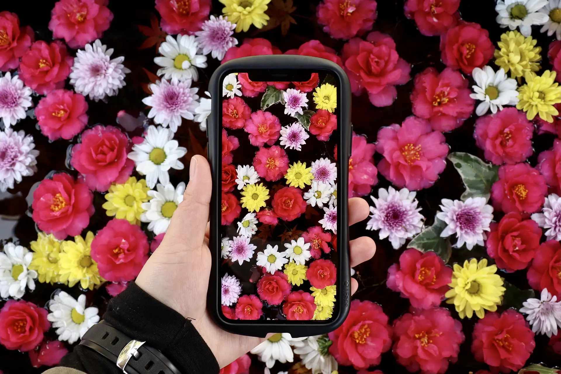 撮影者コメント:ただ花手水を撮るのではなく、まずスマホで花手水を撮り、その後一眼レフでスマホと花手水を一緒に撮りました。 画面いっぱいに広がる花はすごく華やかで綺麗でした。