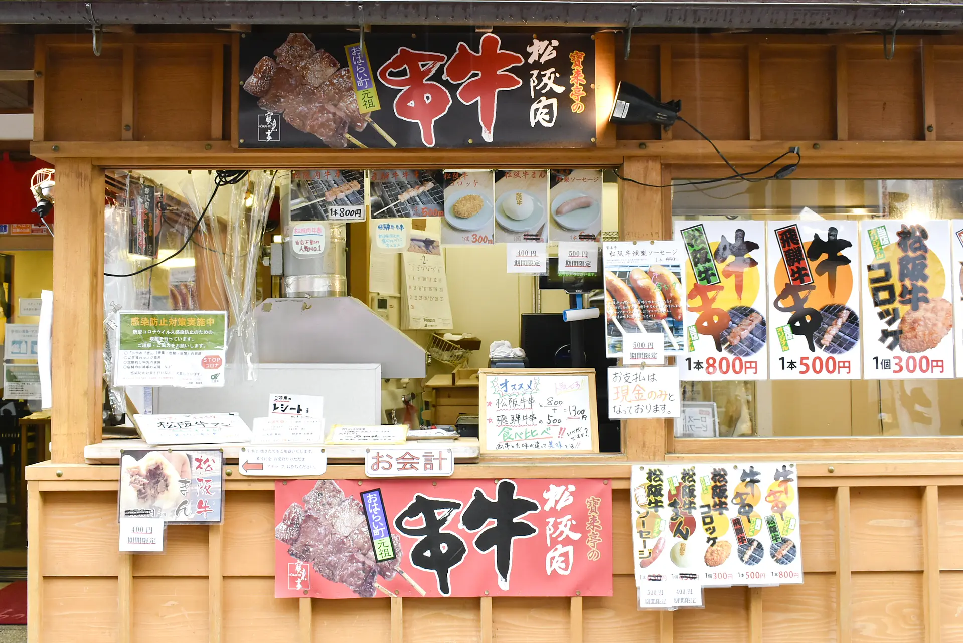 入り口の一角にある大きな「松阪肉 牛丼」と書かれた暖簾も、通りを行き交う人の目を惹きつけてやみません。それにしても、松阪牛を使った牛丼だなんて、なんとも贅沢!