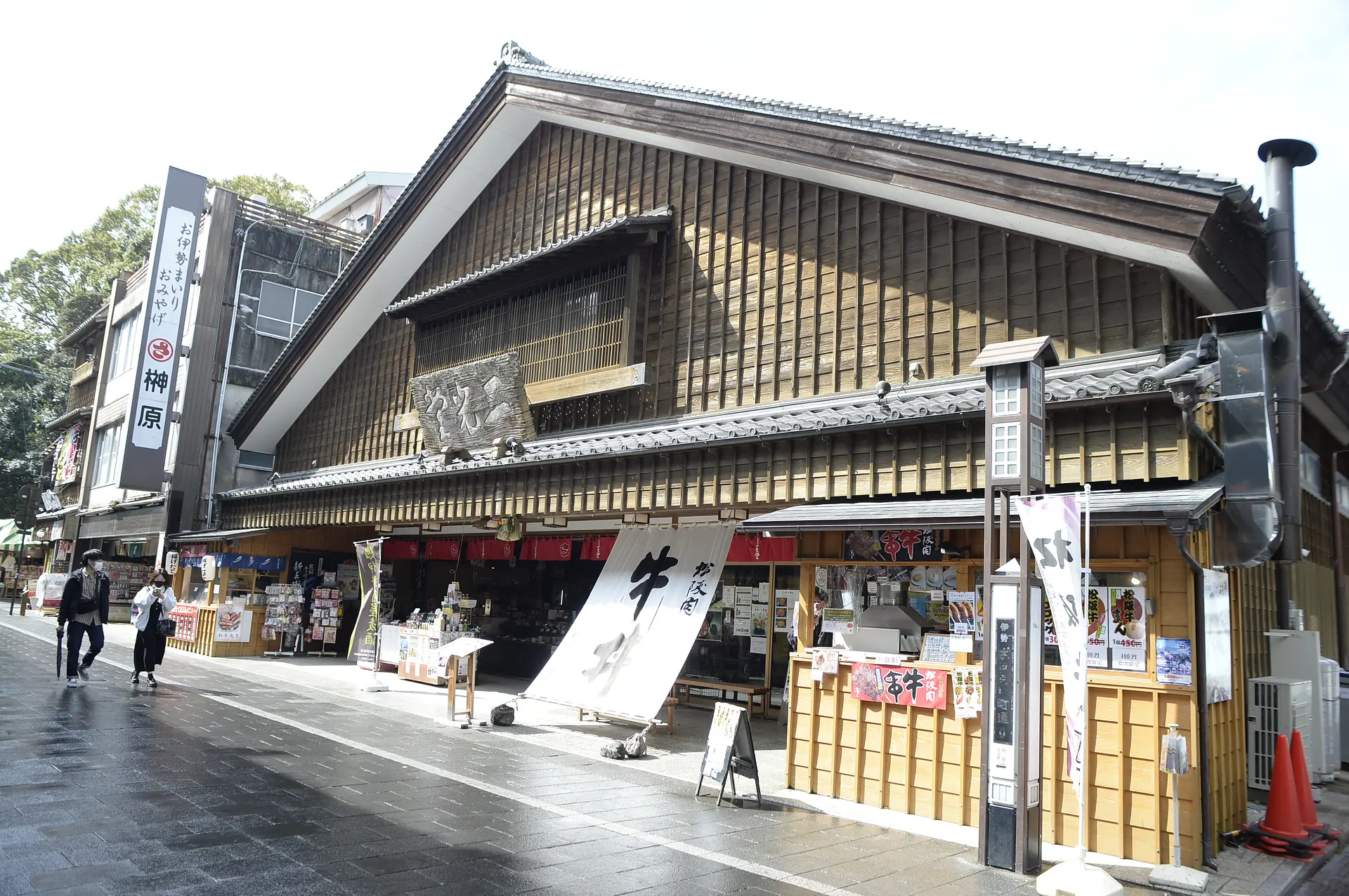 伊勢神宮 内宮の宇治橋から徒歩1分、観光客が行き交うおはらい町で大正時代から参拝客をもてなしてきた老舗店「二光堂(にこうどう)」。観光客に人気のお土産が種類豊富に揃っているのはもちろん、店内にある食事処「寶来亭(ほうらいてい)」の名物ステーキ牛丼は、松阪牛がたっぷり乗った贅沢な逸品!秘伝の醤油だれはご飯との相性抜群で、内宮を訪れたらぜひ味わっていただきたいメニュー。他にも店頭では松阪牛を使った牛串や肉まん、コロッケといった気軽に食べられるメニューも販売しています。