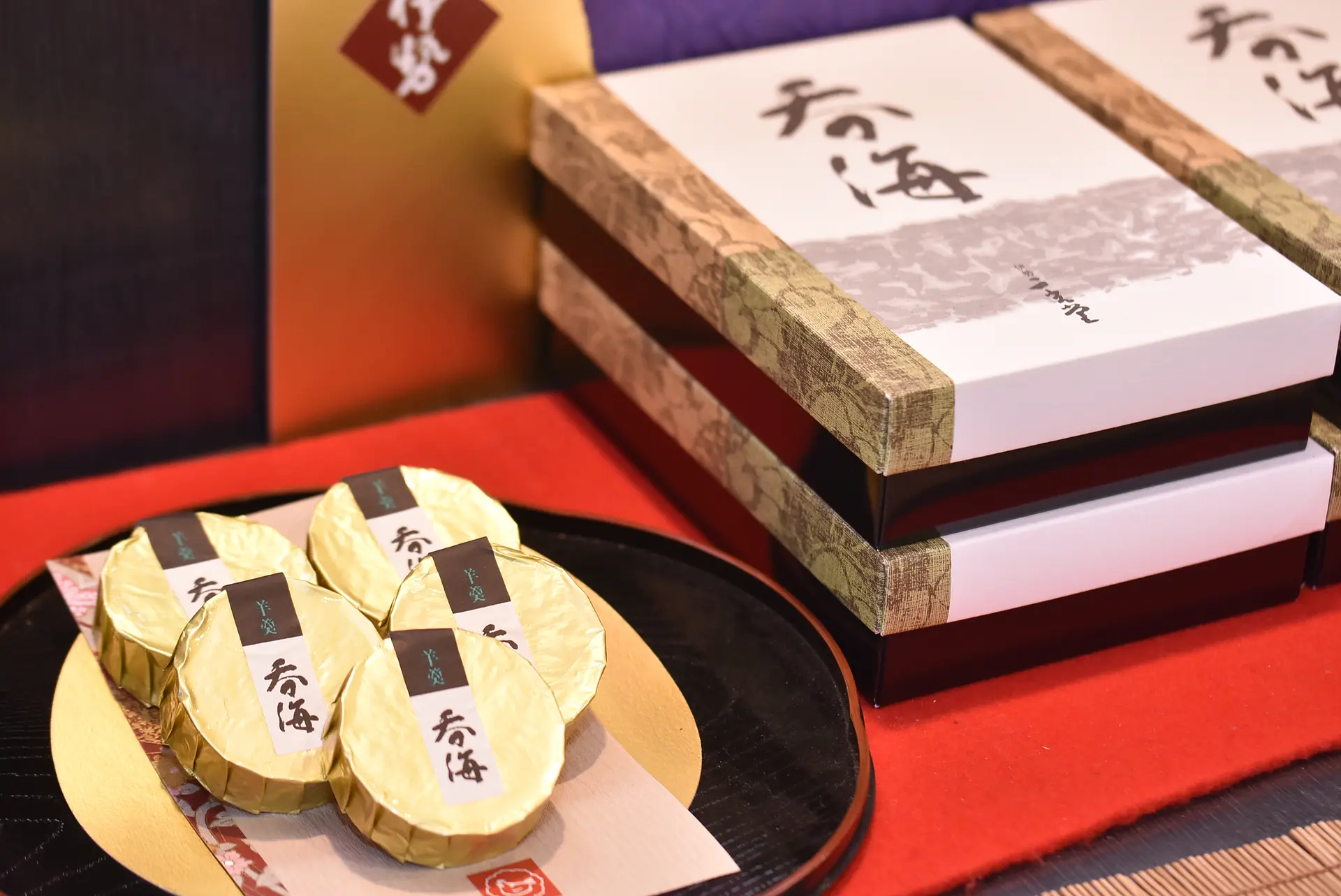 あっさりとした味わいの羊羹の中には、もち米の粉に砂糖や水飴を練り込んでもっちりとした味わいが魅力の求肥(ぎゅうひ)が入っています。
