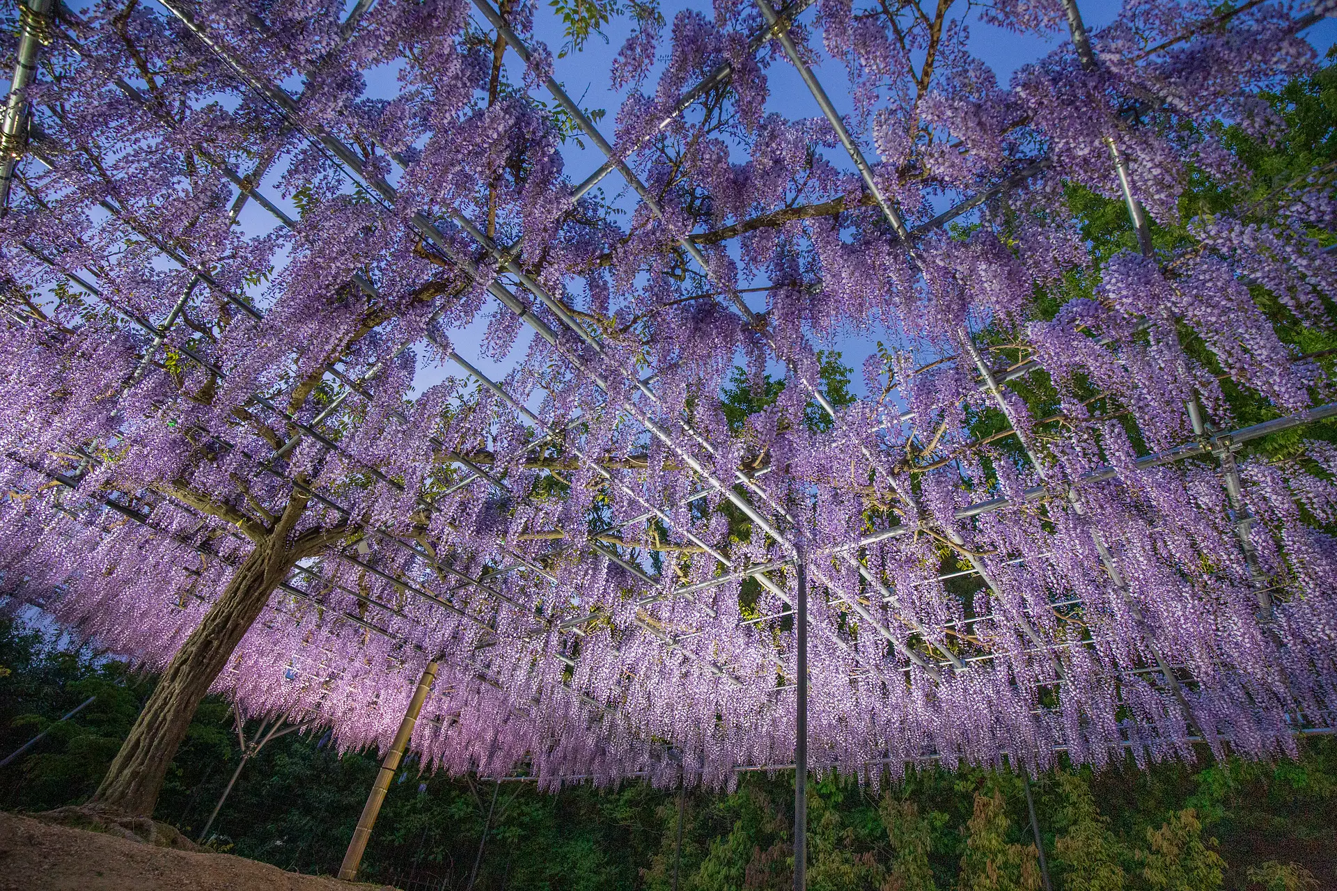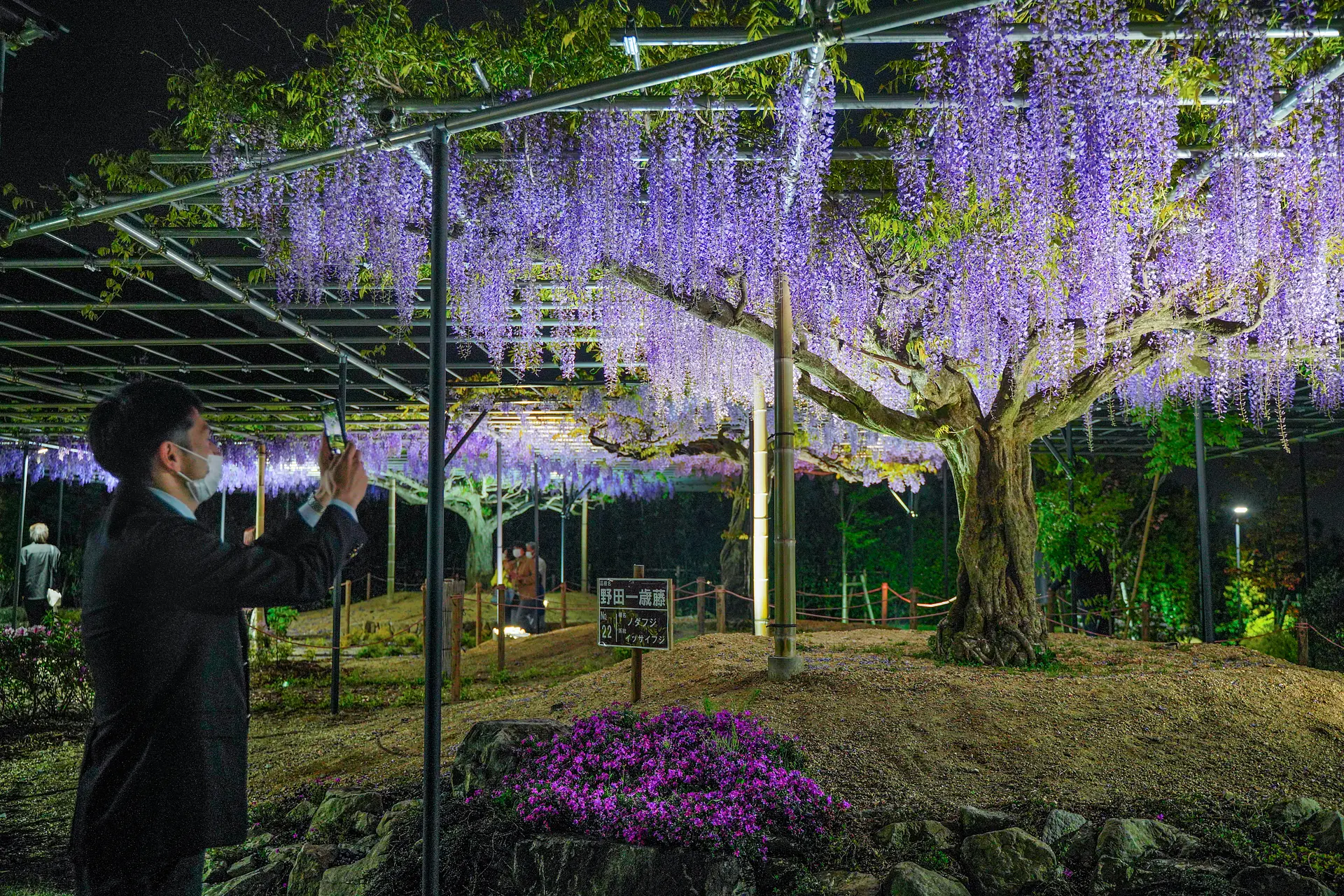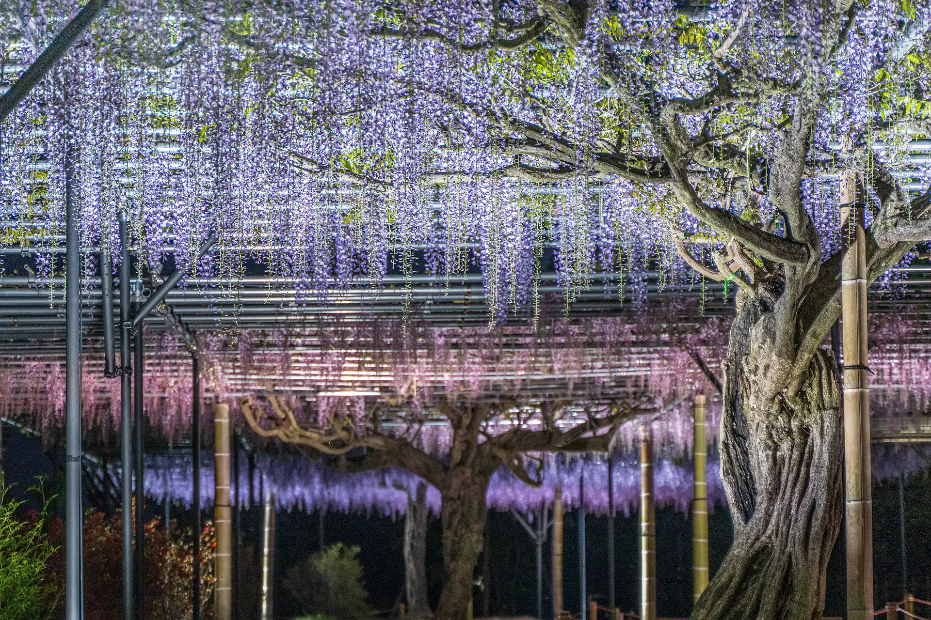 開園期間中は毎日18時からライトアップを実施!光に照らされて浮かびあがる紫色の花房の、幻想的な景色に思わず魅入ってしまいそう。