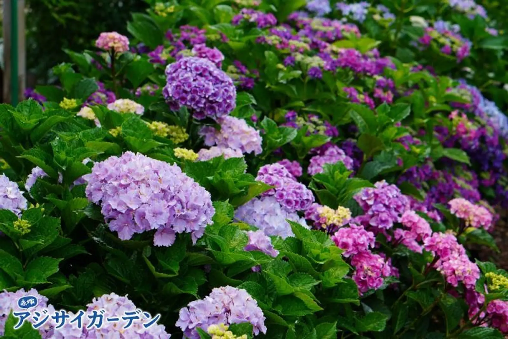 梅雨の頃になると、大きく美しい花を涼やかに咲かせるアジサイガーデンが見頃を迎え、白やピンクのアナベルといったアメリカアジサイ、円錐状に花をつけるピラミッドアジサイ、ヤマアジサイなど、約100品種1,000株のアジサイが楽しめます。