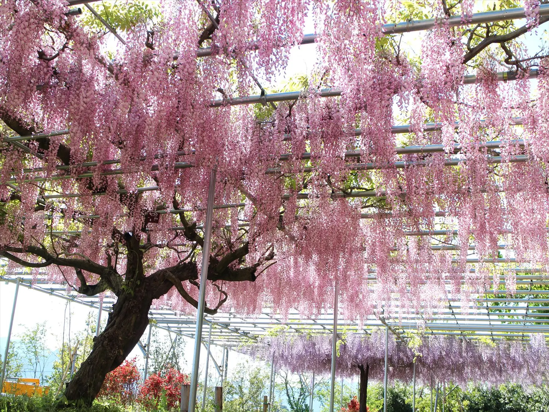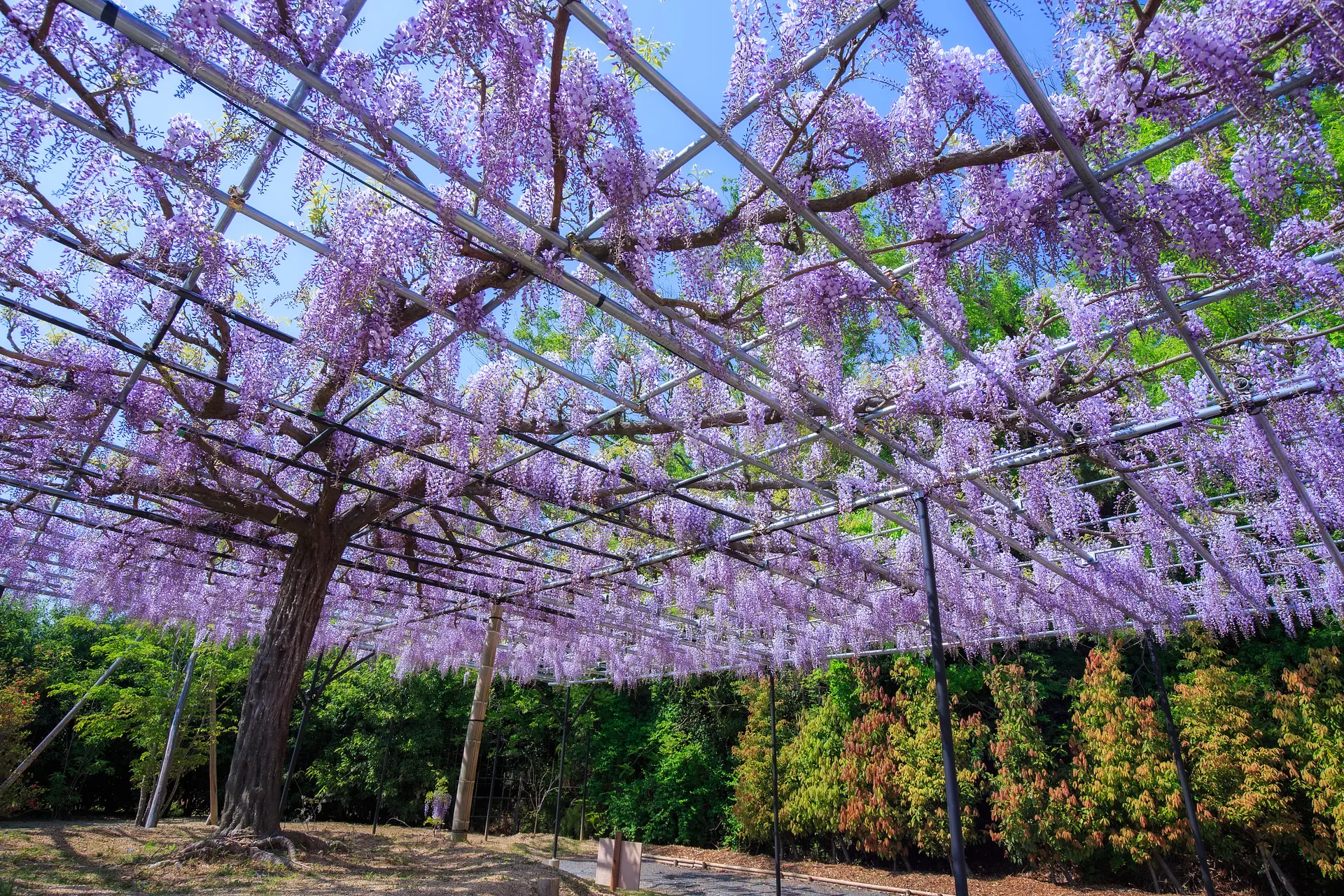 今回新たにオープンする「藤のガーデン」は広さ約5,000平方メートル、一般的な淡い紫色の藤だけでなく、白やピンクの花を咲かせるものなど、満開時には色鮮やかな名木・巨木が咲き誇ります。