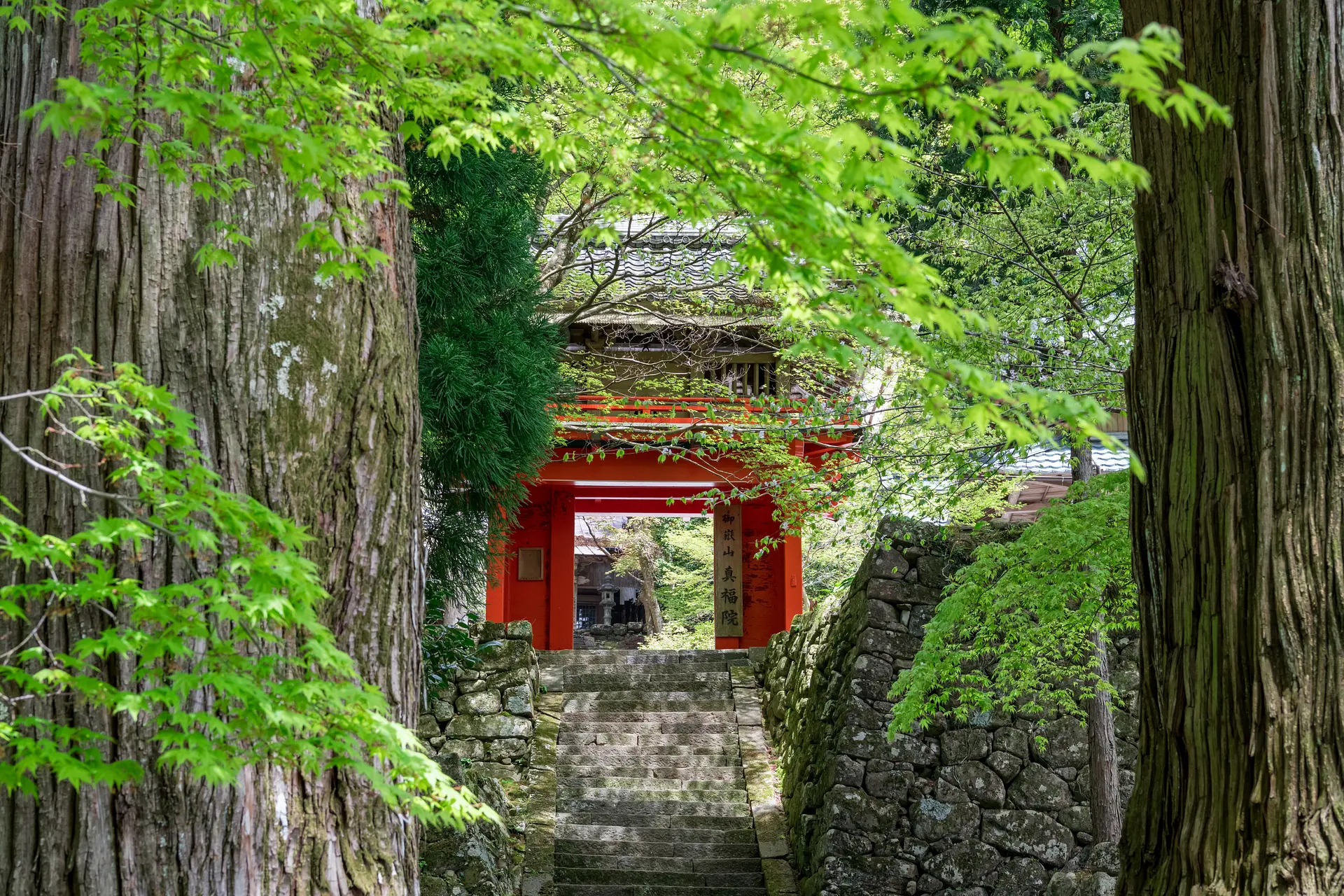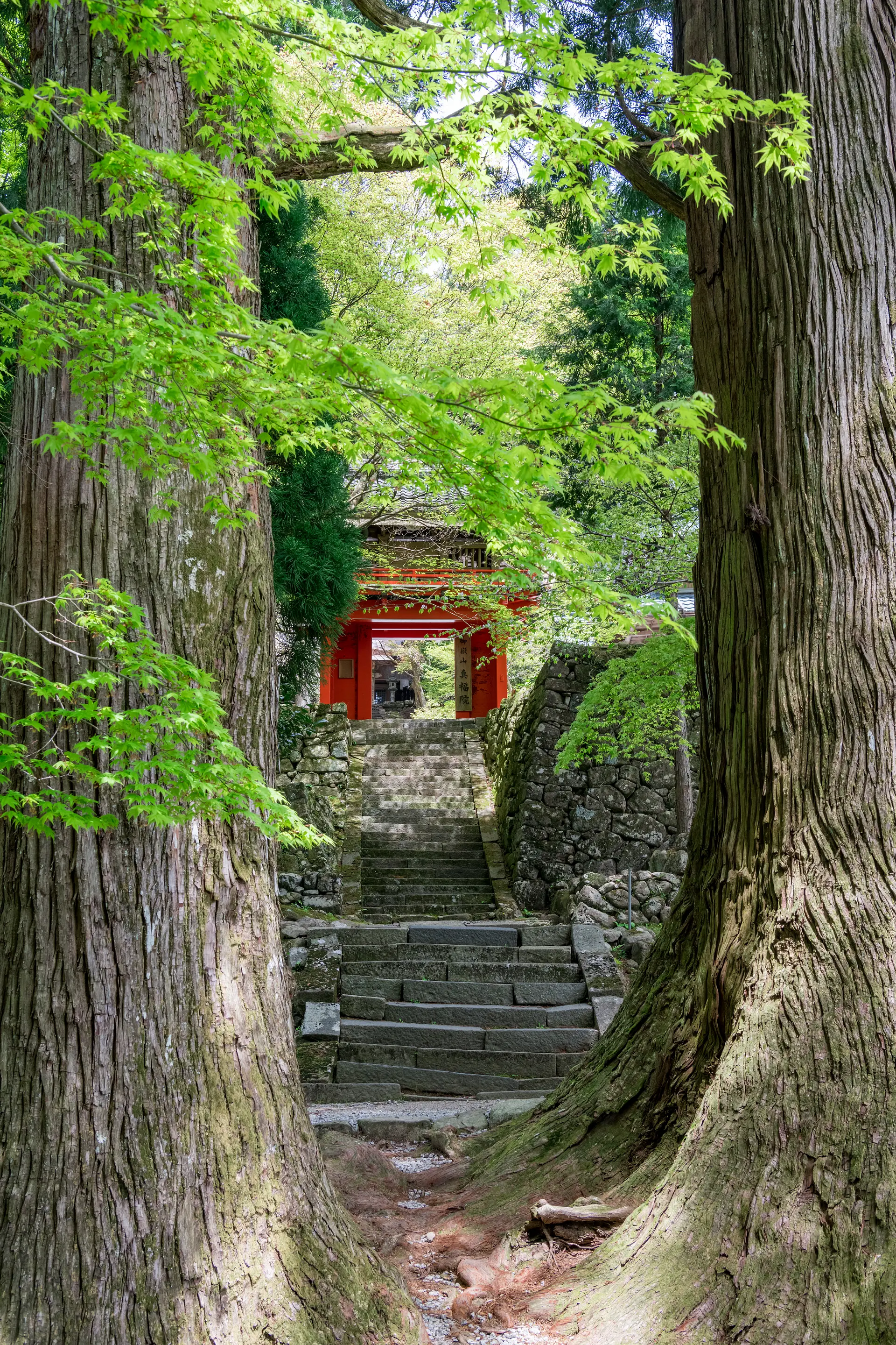 更に進むと、参道の新緑と2本の大杉の間から見える朱山門がとても良い感じです。これからの時期は新緑に朱が映えます。秋の紅葉も絶景間違いなし!最近はinstagram等でもよく見かける様になったポイントですね。