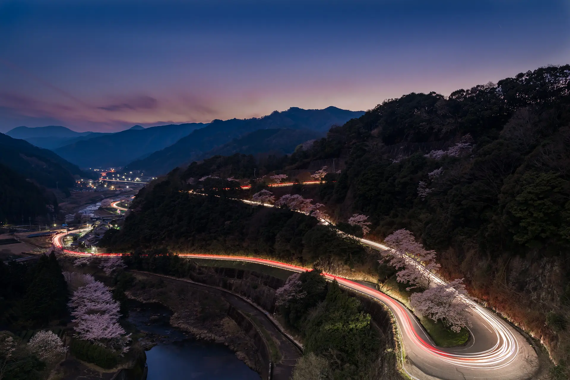 夕暮れ時も綺麗です!三脚等でしっかりと固定して長時間露光撮影をすればこんな写真も撮れます。車のライトの光跡と、それに照らされた桜が良い感じゃないですか?