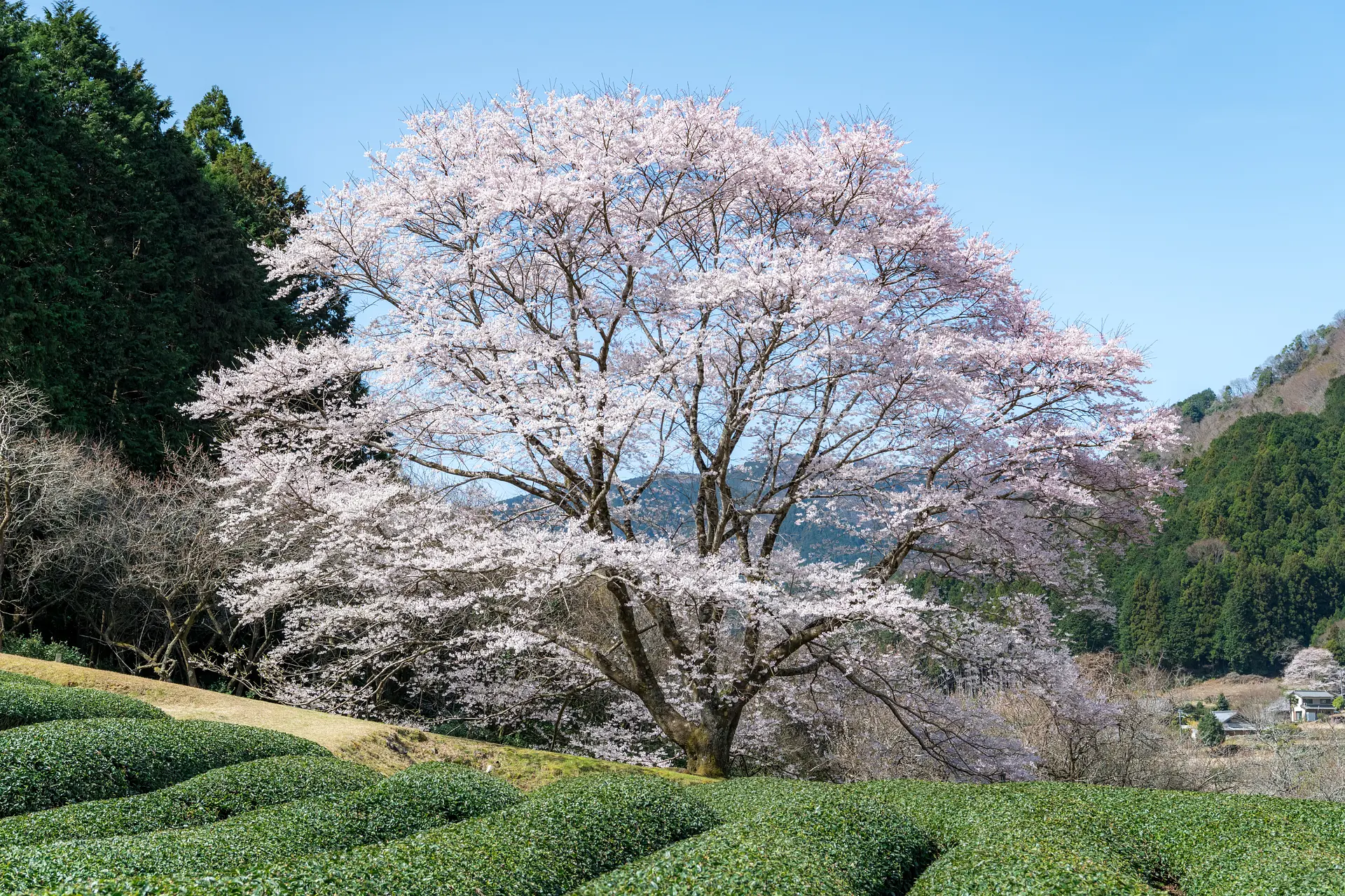 よこや製茶さんの敷地内にあります。茶畑の緑の中に桜色が映えます!
