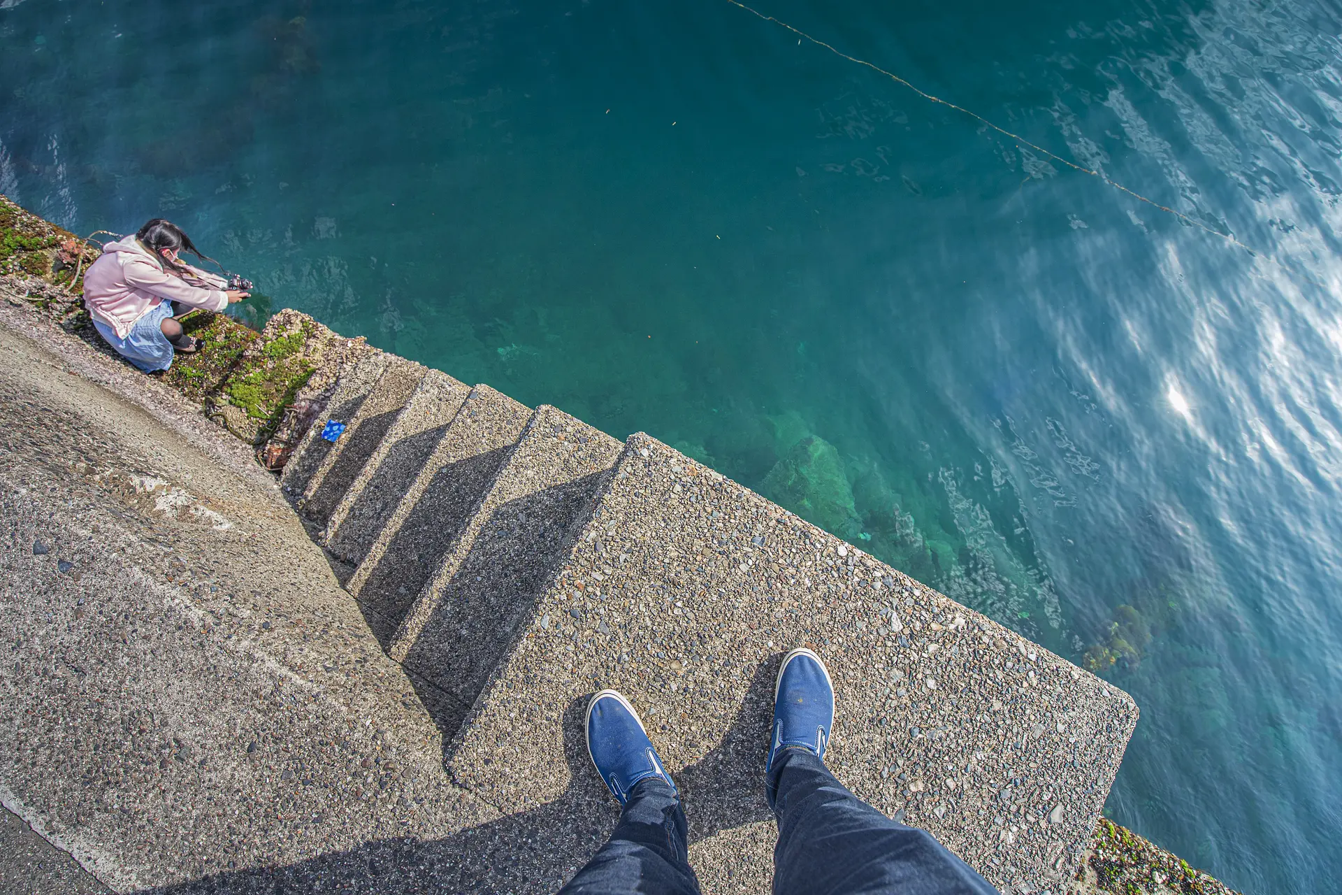 堤防の各所には、船へ降りる階段があります。ここからカメラを水面ギリギリのローアングルで撮影してみると....