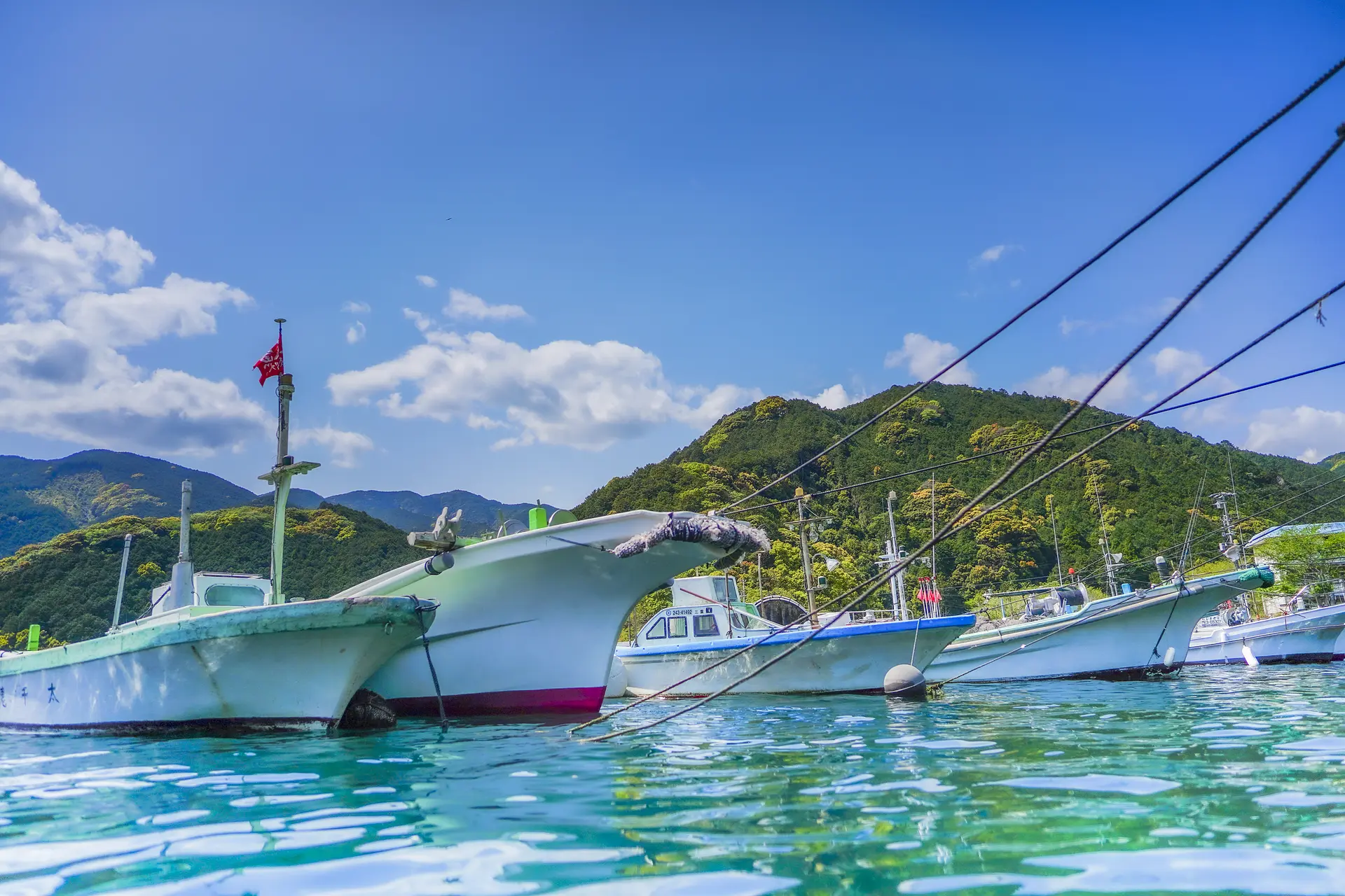 九鬼漁港を背景に、停泊する船を撮影しました。九木神社の鳥居周辺からこの光景を眺めることが出来ます。