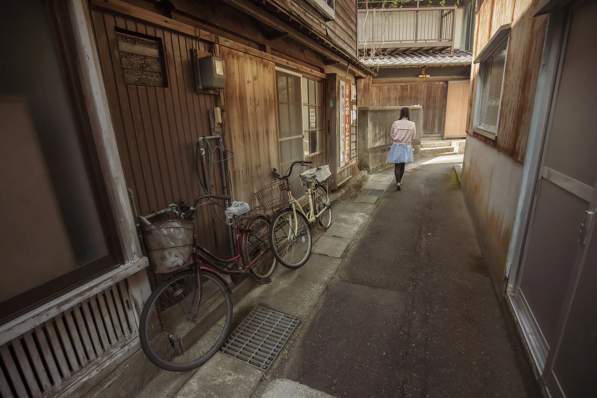 九鬼町の路地を歩くと、住宅の窓の隙間からテレビやラジオの音が聞こえてきます。昭和の風情あふれる光景に心癒されました。