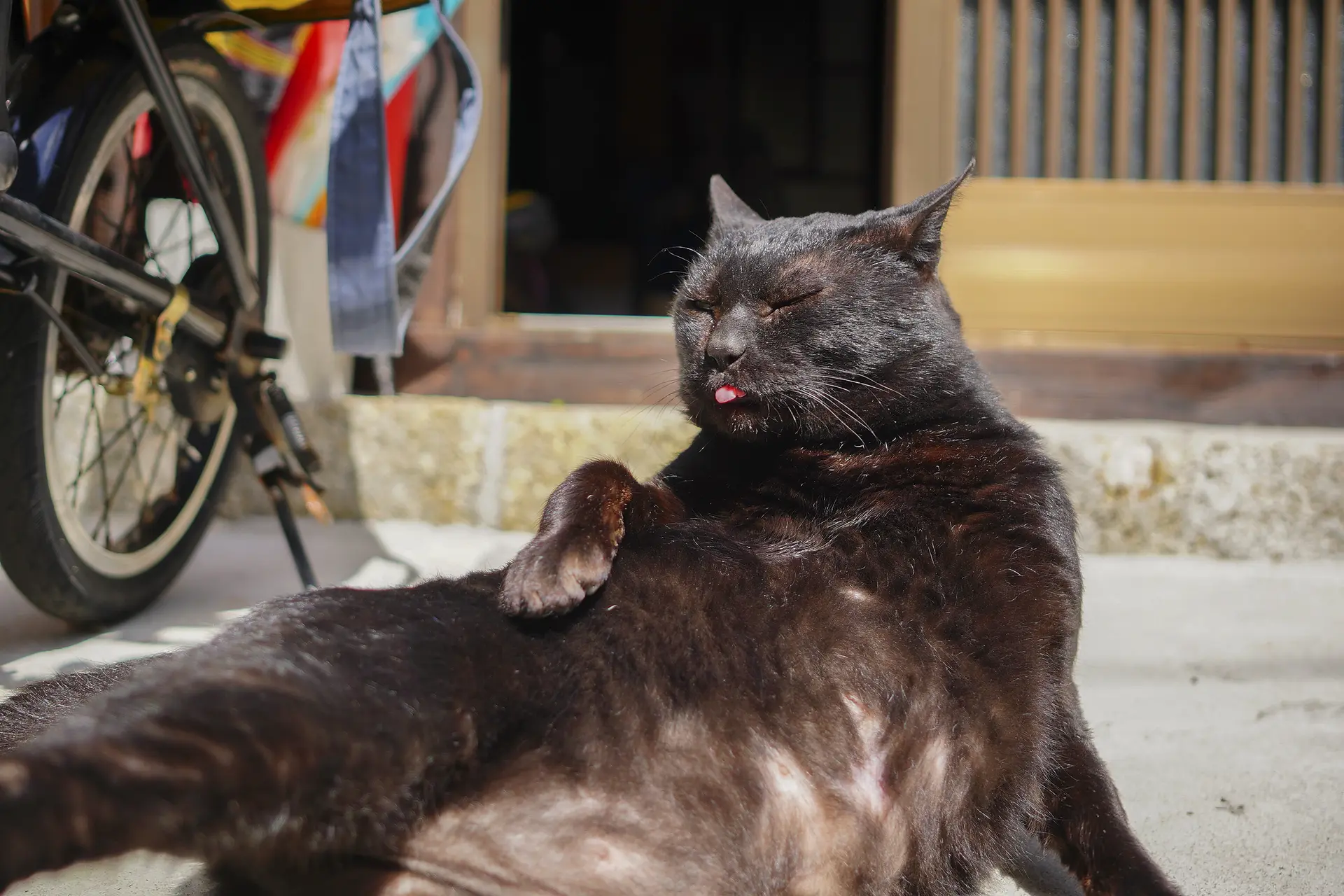 可愛いにゃんこに遭遇。玄関先で日向ぼっこの光景をパシャリ。