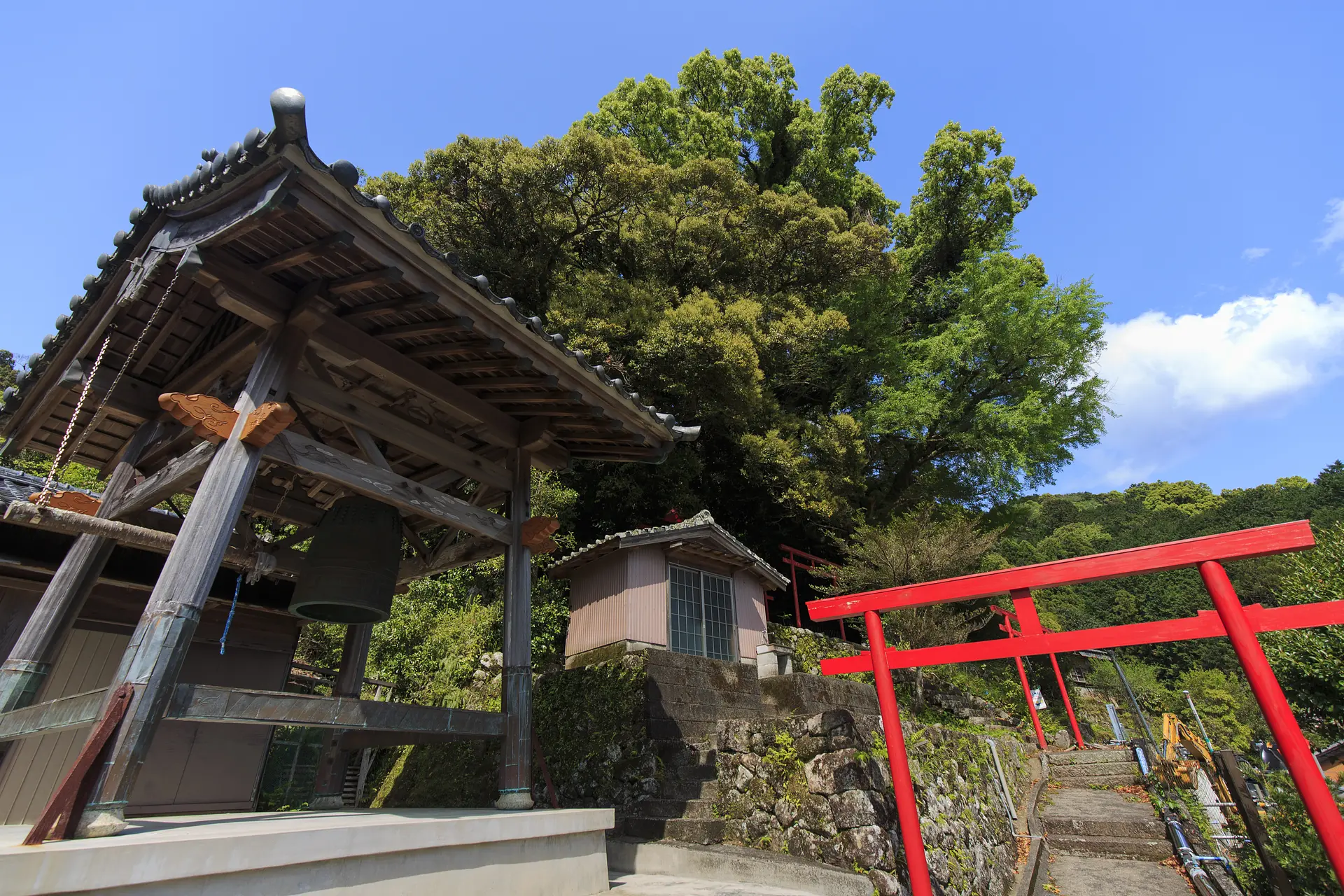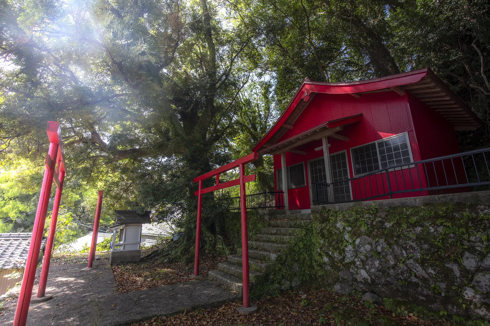 高台にある神社。参道には赤い鳥居があり、樹齢300年以上と言われる大楠が立ちます。