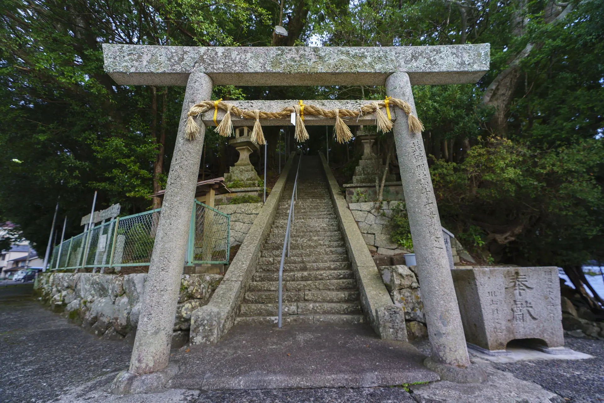 九鬼神社は、集落からほんの少し離れた場所にあり、九鬼漁港を越えてすぐのところに参道の鳥居があります。