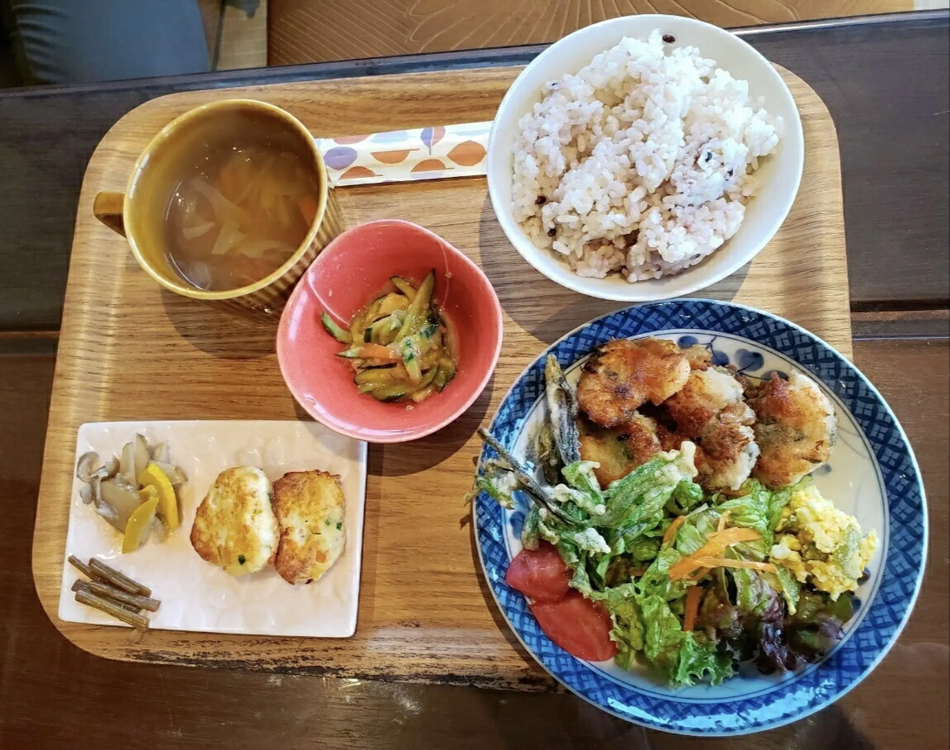 訪れた日のメニューボードに書かれていたごはんランチ(コシアブラの天ぷらと豆腐のもちもち焼き)を頂きました!どれも美味しくて、ボリュームも文句なし!しかも健康にも良さそうでいいところ尽くしです!!