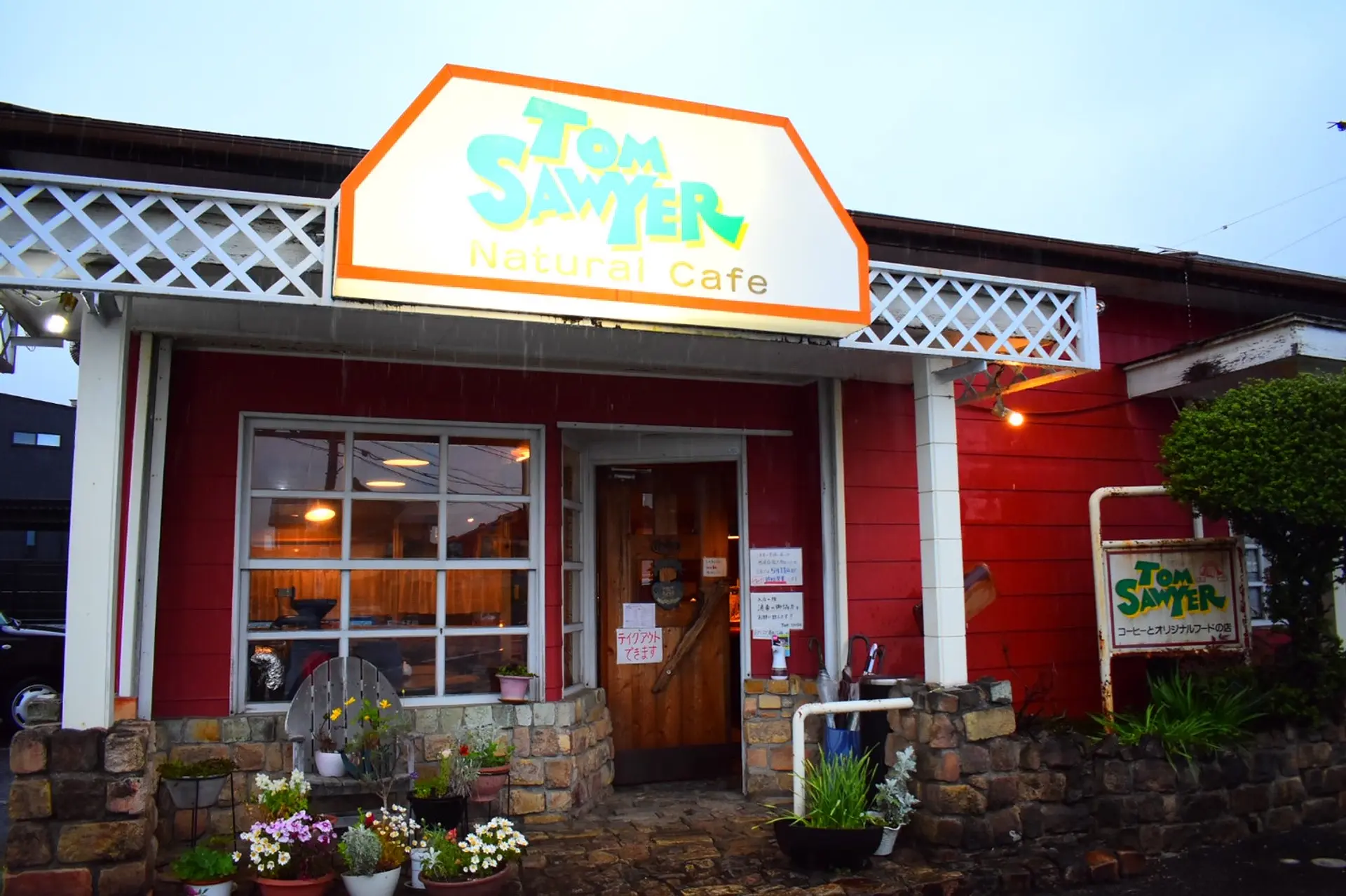 赤い壁でレトロな雰囲気のお店が湯の山街道沿いに聳え立っています。それがTom Sawyerです!!看板には股から顔を出している少年が描かれています!(笑) ※ASOBISIA冒険MAP参照