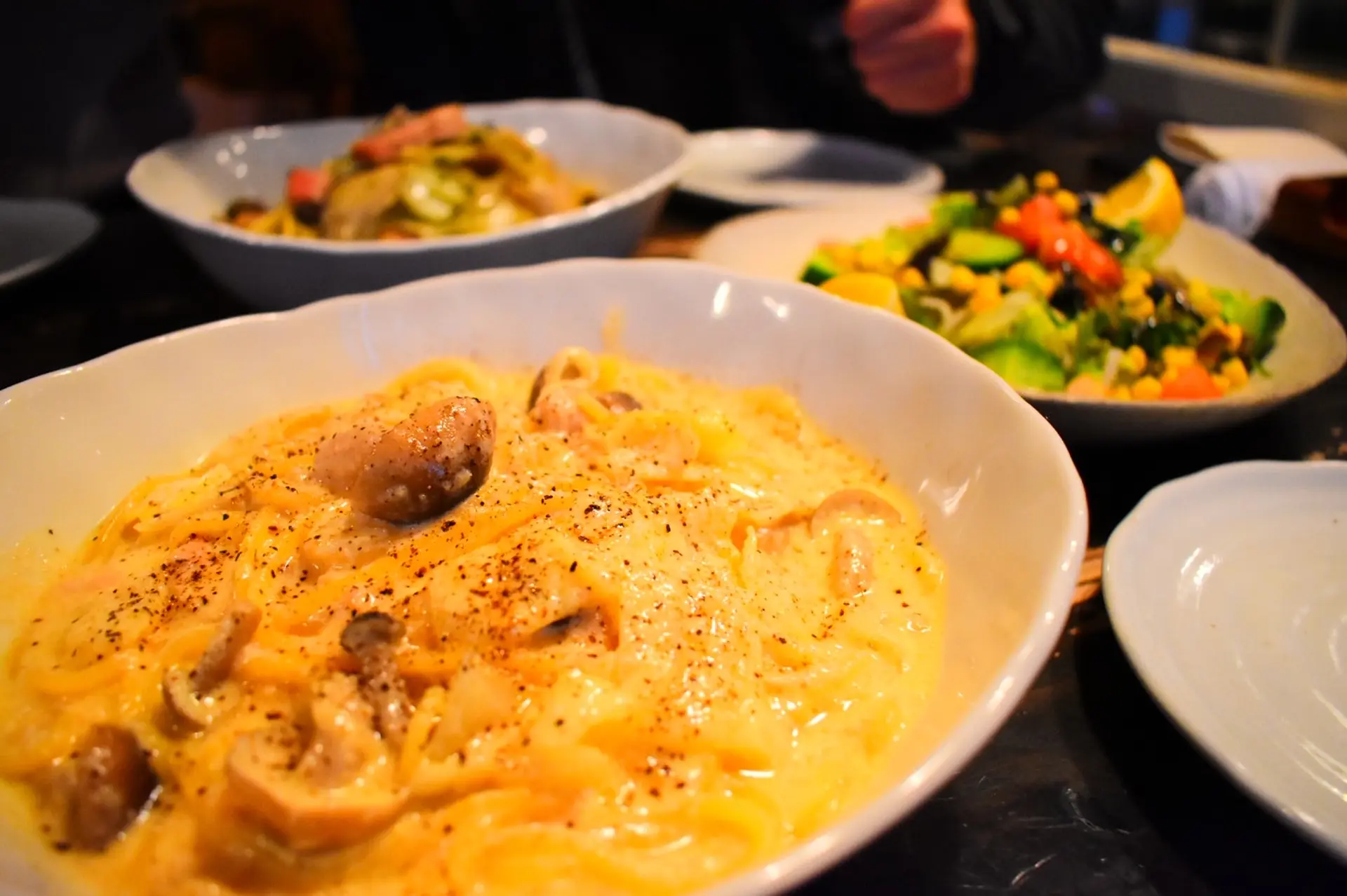 カルボナーラはパスタにソースがよく絡む、濃厚なクリームソースでした!バジルソースはきのことの相性が抜群でクセになる味でした!