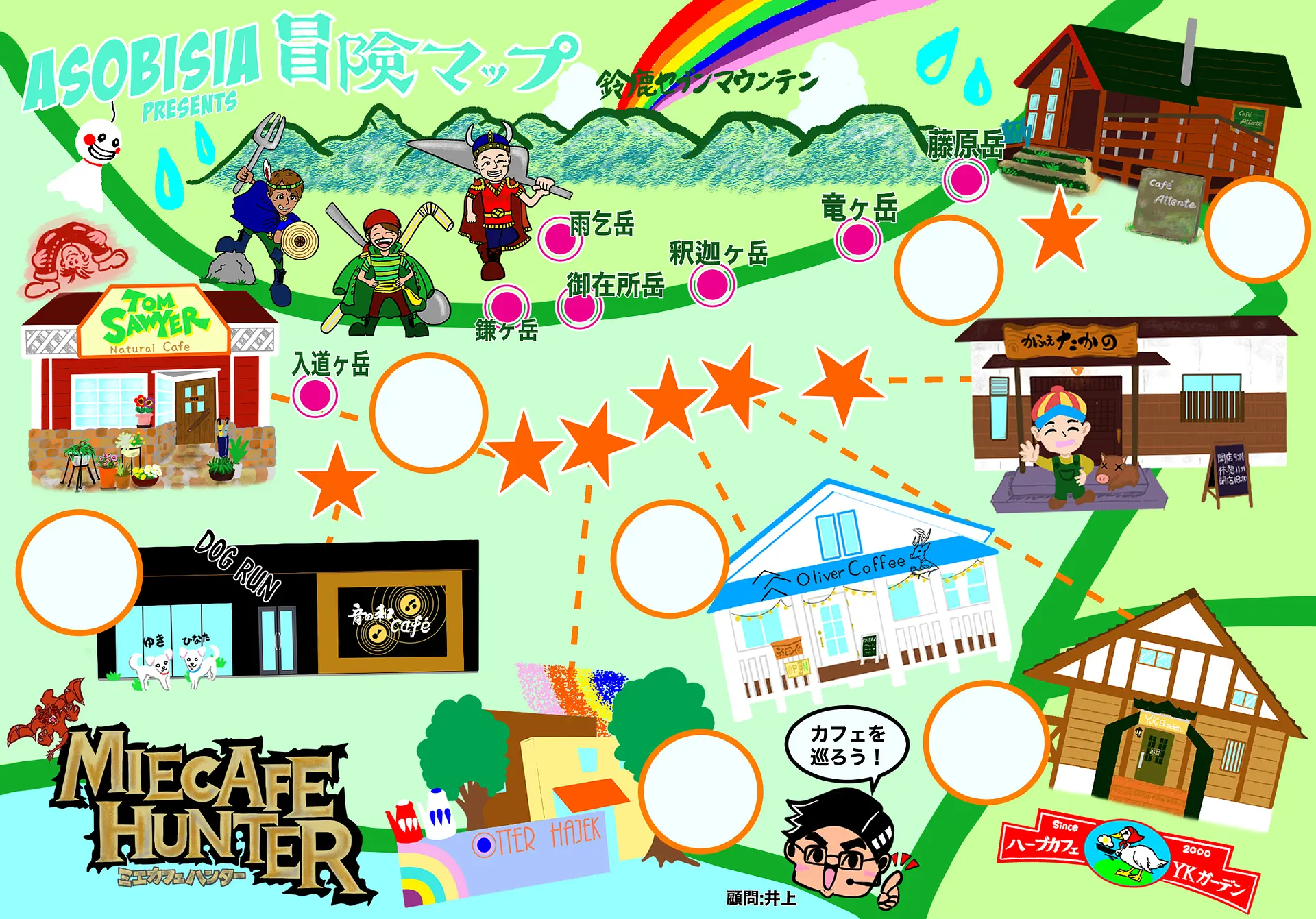 我らMIE CAFE HUNTER(ミエカフェハンター)!今回は「鈴鹿セブンマウンテン」の麓にあるカフェを攻めるようだ。。!!カフェで美味しく、楽しく、のんびり食事をすれば、雨の日だって心はきっと晴れるはず!MIE CAFE HUNTERと一緒に、「鈴鹿セブンマウンテン」にちなんで七つのカフェを見つけ出せ!さぁ君も、ASOBISIA冒険MAPを手にしてクエストに出発だ!!!