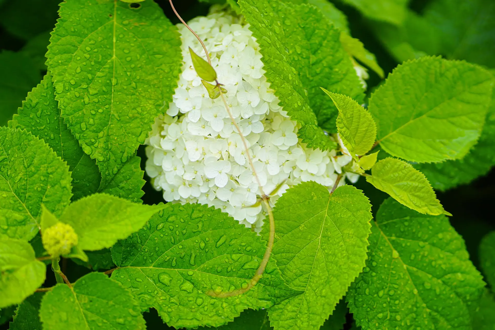 紫陽花は天候を選びません。雨の日なら葉っぱや花びらについた水滴を写してみましょう。