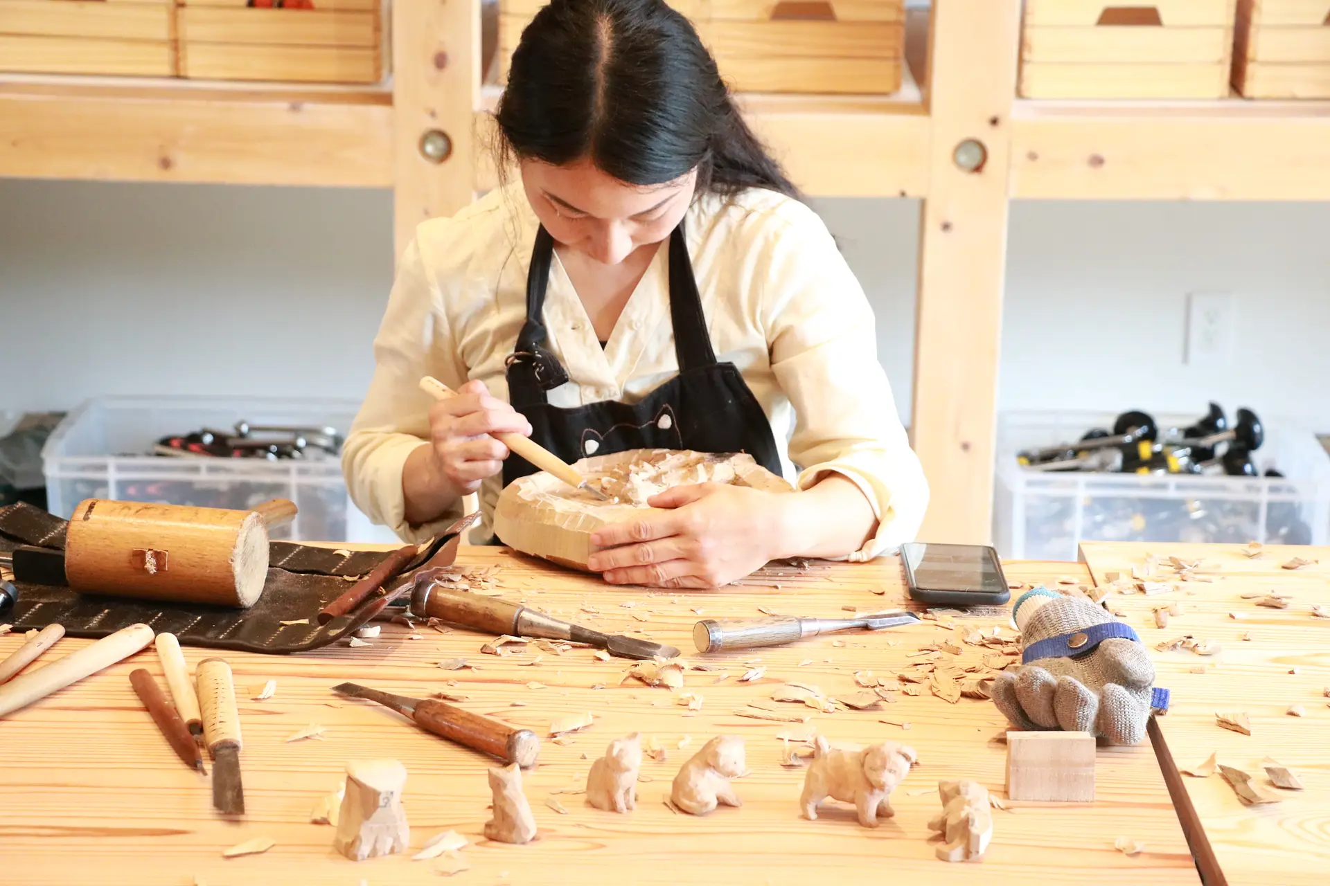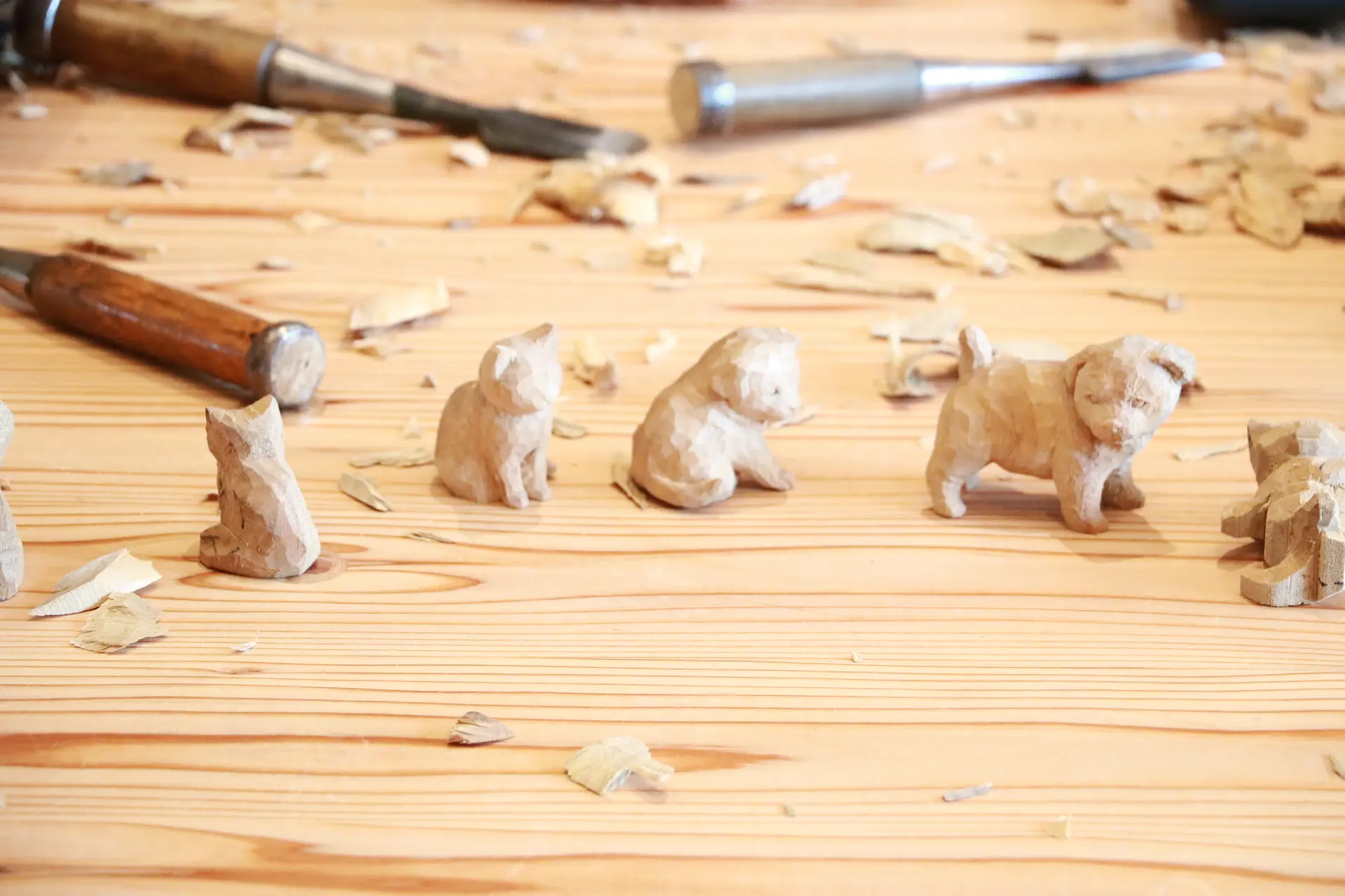 彫刻刀やノミなどを用いて、手のりサイズのどうぶつ木彫りが作れるワークショップです。