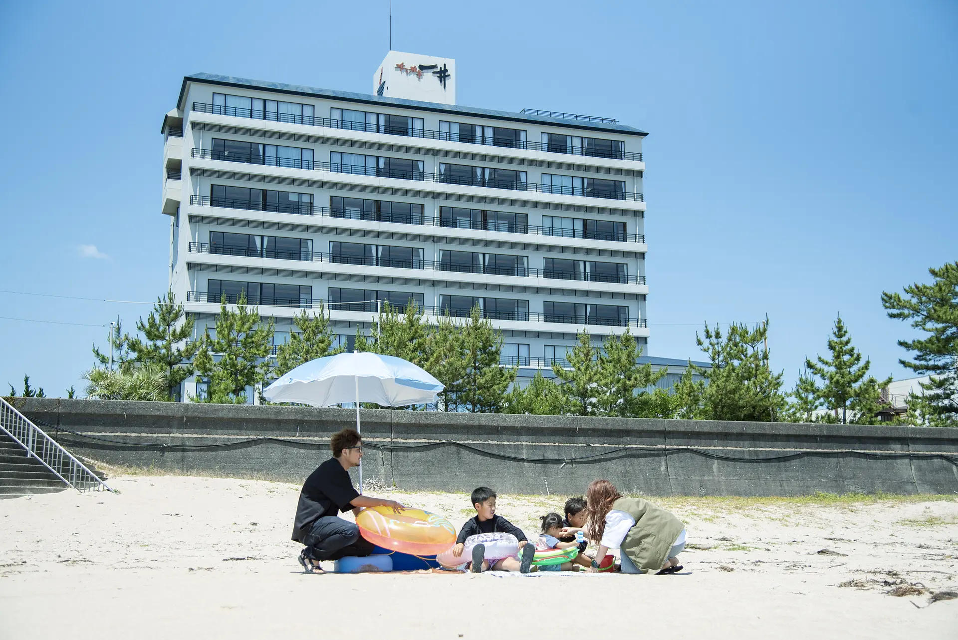 実は、千鳥ヶ浜海水浴場のすぐ目の前にある「浜の雅亭一井」は、海水浴を快適に楽しめるうれしいサービスがこれでもか!と充実していて、海水浴と宿泊の両方を思う存分楽しめるファミリーにぴったりな宿なんです!