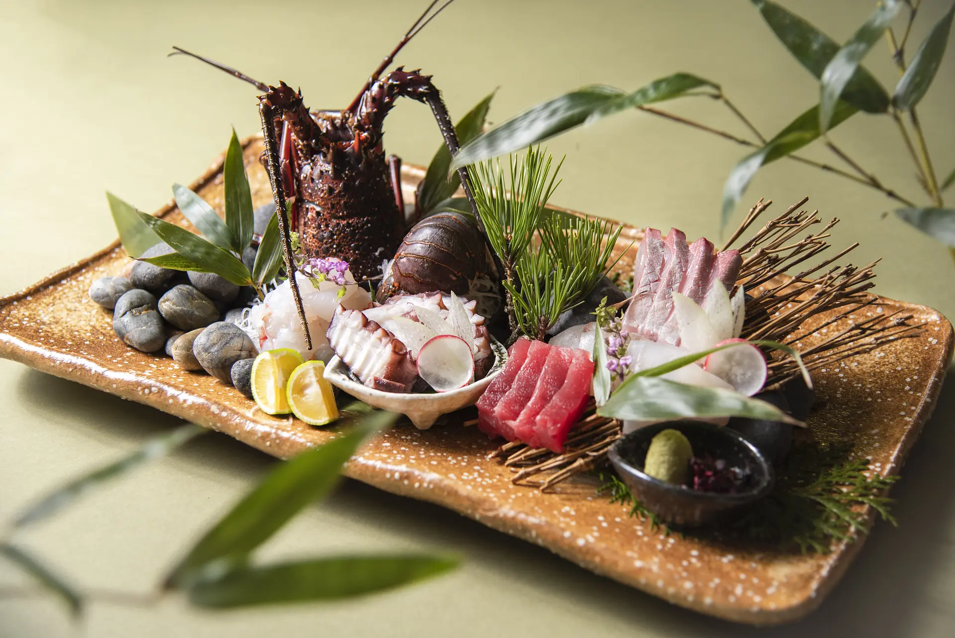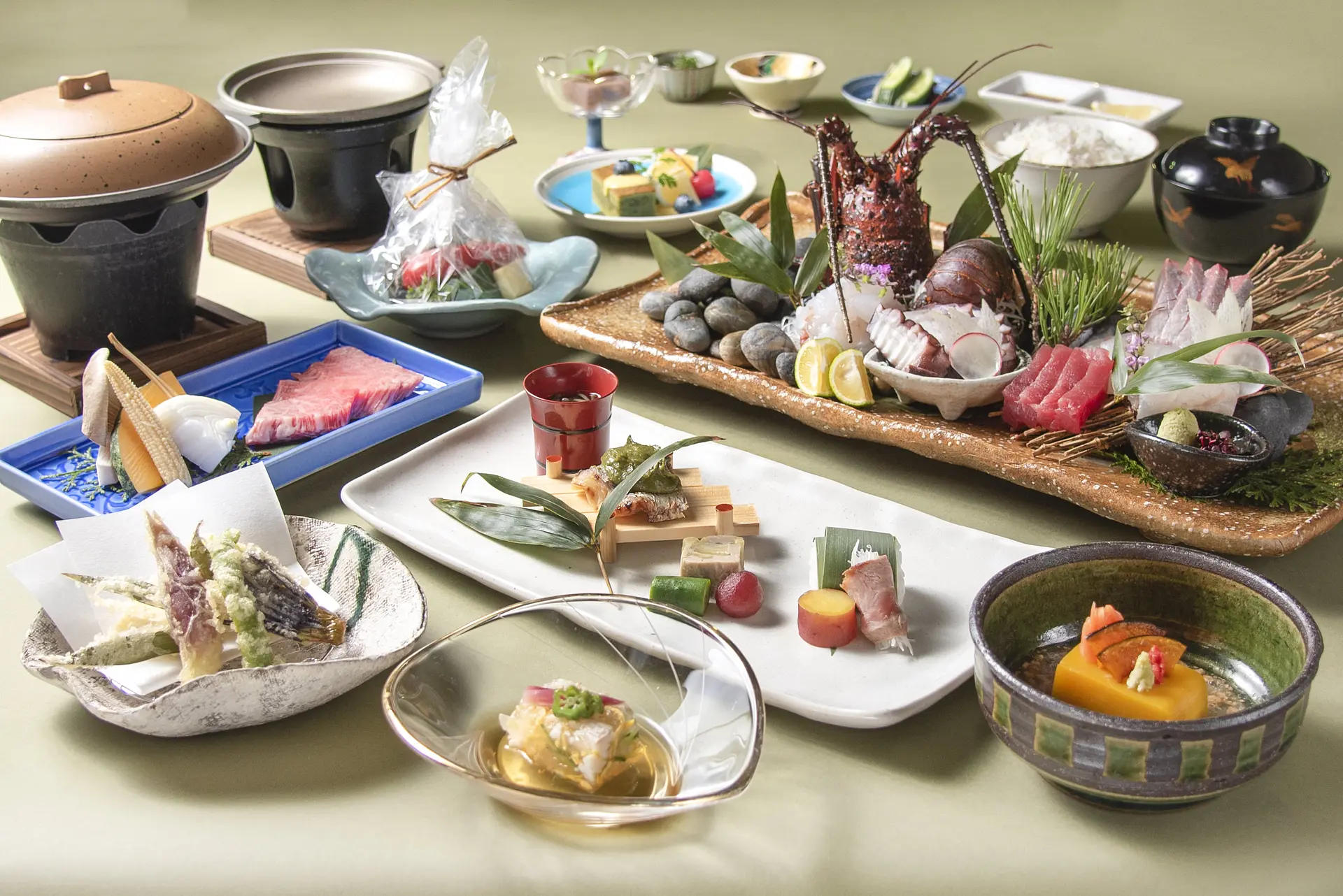 料理長が厳選した食材でつくる会席料理では、「伊勢海老」や「鮑」、日本三大和牛の「松阪牛」に加え、地元相差で獲れる「あらめ」などの海藻やその日に獲れた新鮮な地物を味わうことができます。