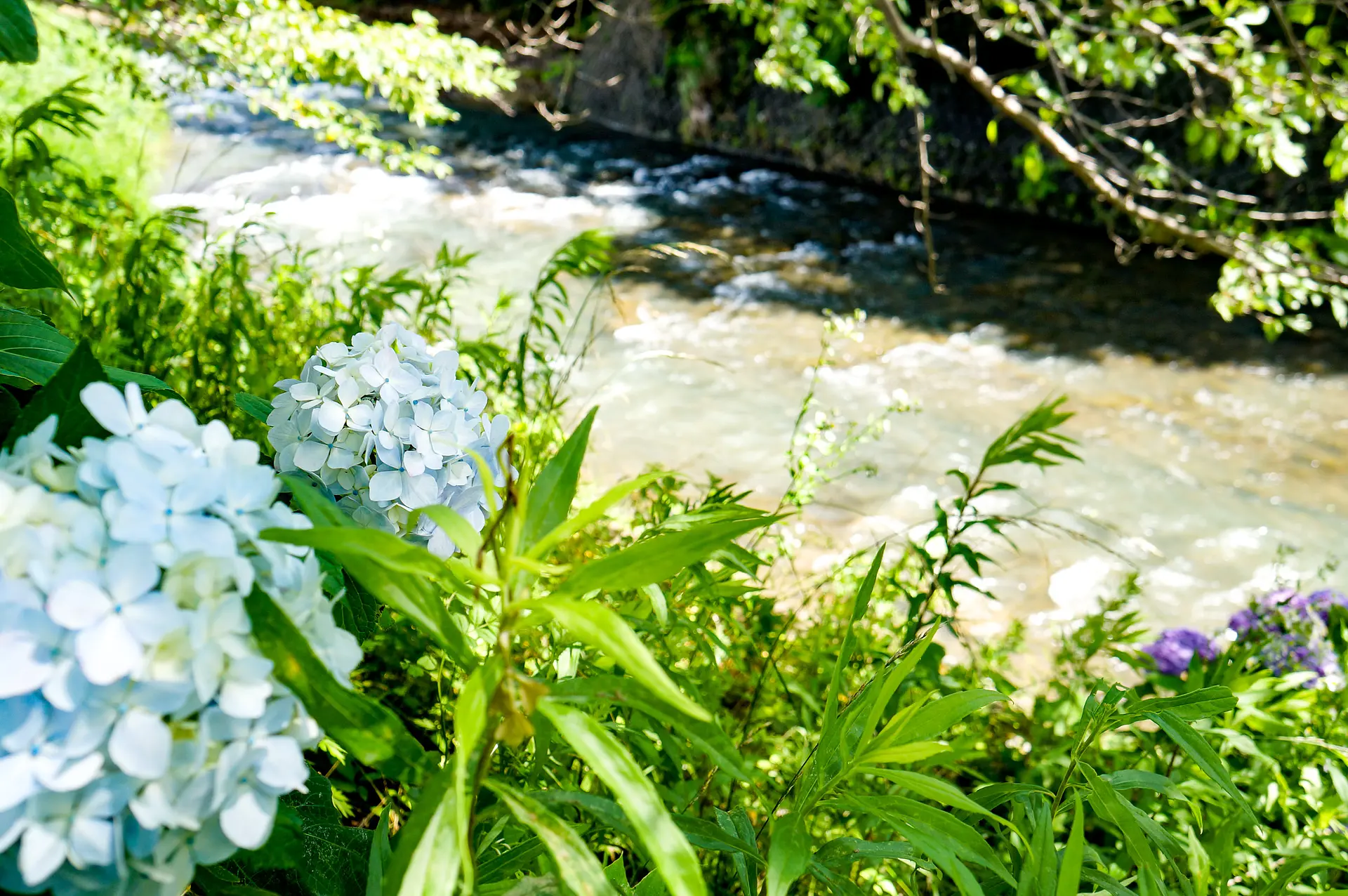 取材したのは6月下旬。川沿いの道には鮮やかな紫陽花が咲き、景色に彩りを添えてくれています♪