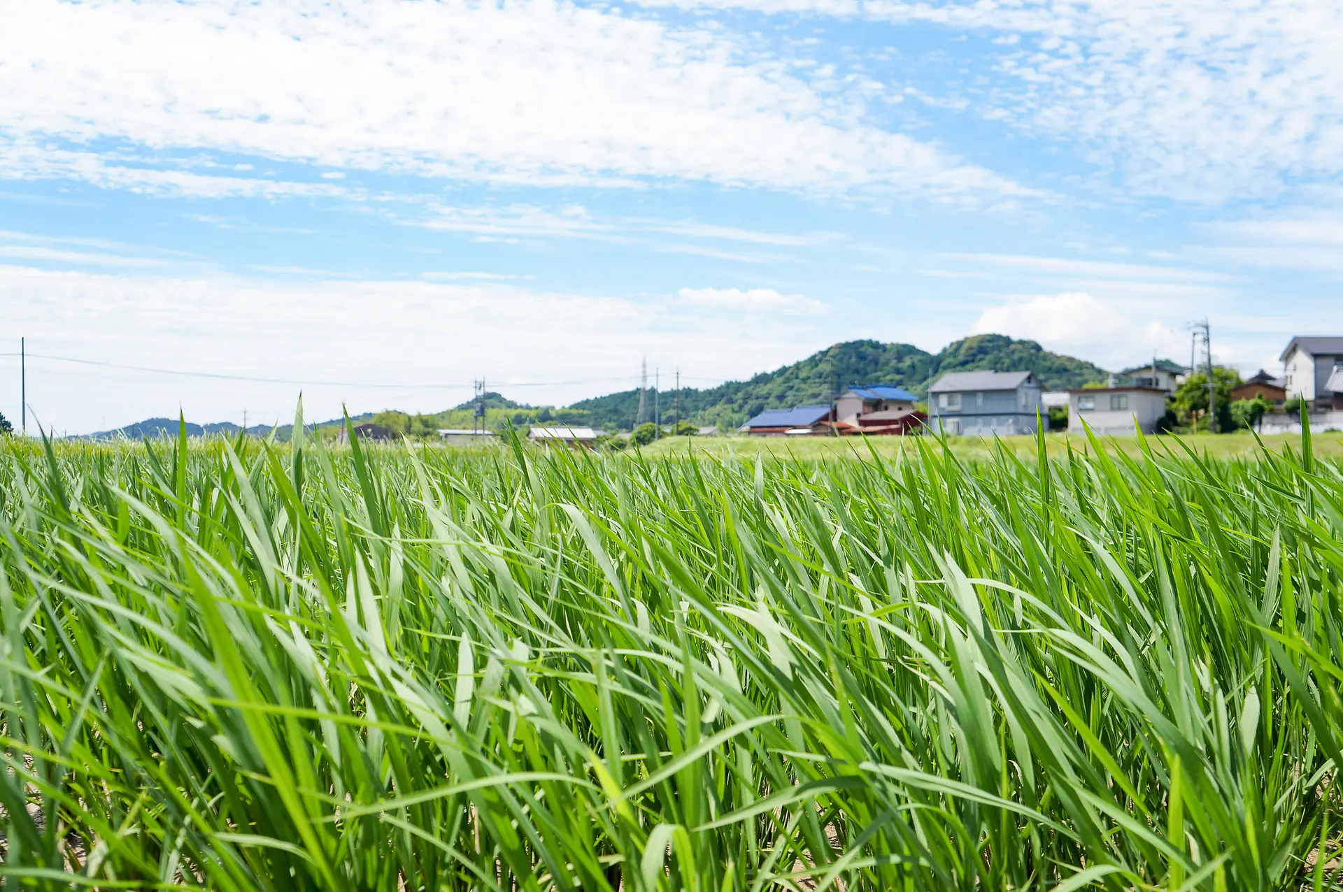 風にそよぐ青々とした稲苗は今の時期ならではの眺め。今日の青空に映えてとてもきれいですね。