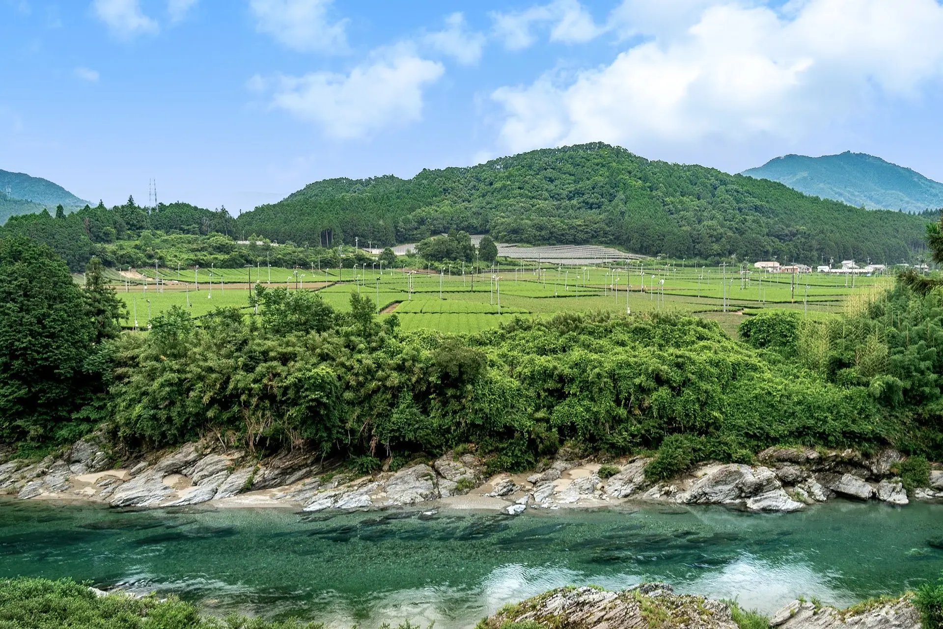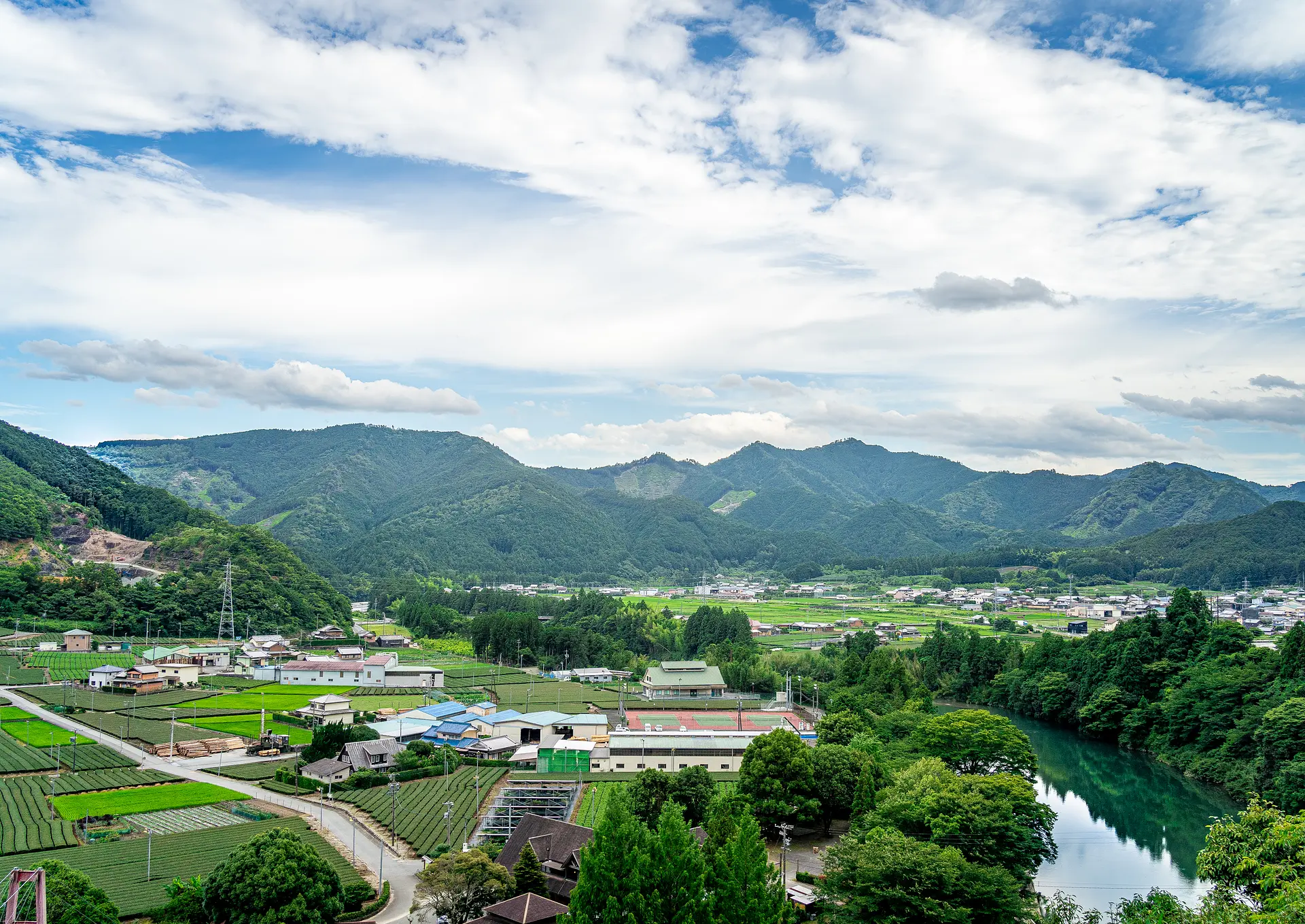 実は三重県はお茶の生産量が全国第3位のお茶処で、ここ香肌峡では櫛田川に沿うように緑の山々と茶畑が広がっています。