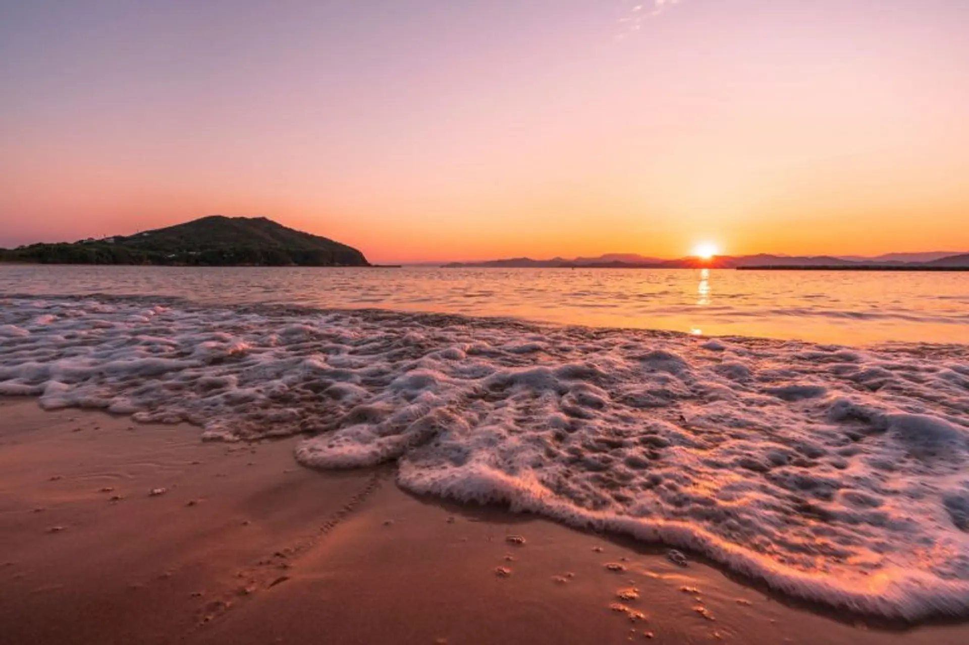 水平線に沈みゆく夕陽を眺められます。海水浴シーズンはバンガローやコテージを併設した海の家もあるので、1泊2日で海を満喫するのもオススメ。※9月末まで営業する海の家あり