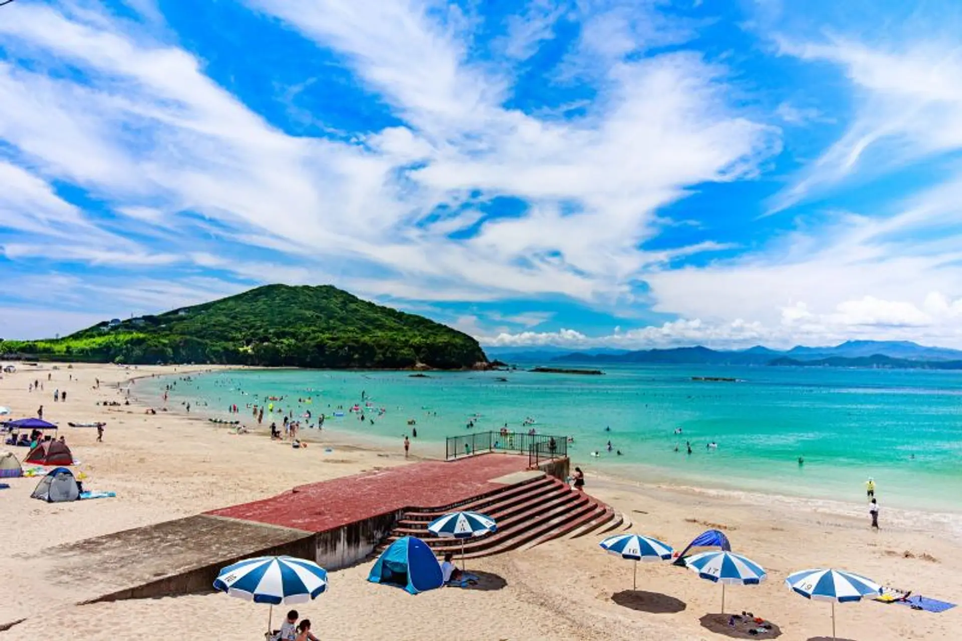 あづり浜(阿津里浜)は浅瀬の砂浜で夏は海水浴で賑わう場所。海開きシーズンでも混雑はあまりなく、穴場の海水浴スポット。