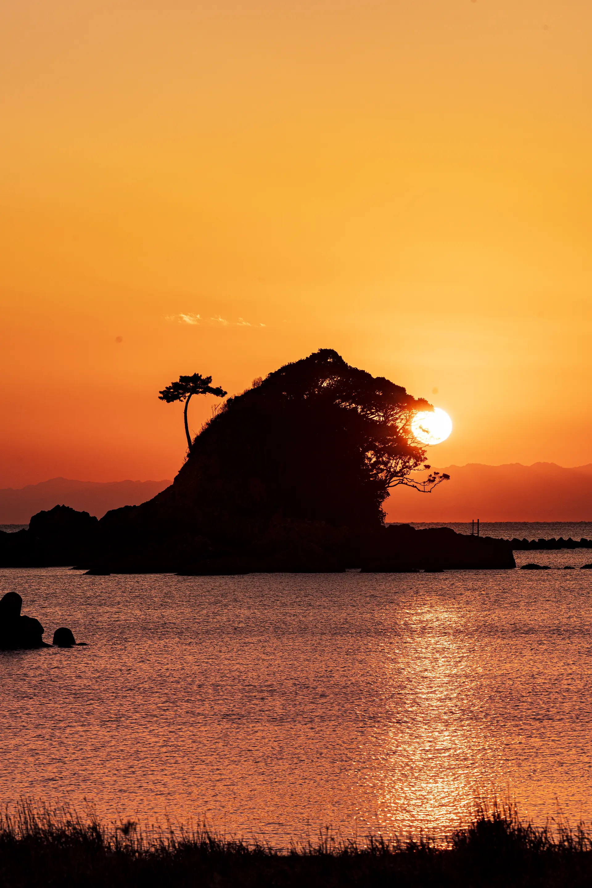 まるでゴジラのような形にみえる無人島「雀島(すずめじま)」が浜の中央にあり、12月〜1月は夕陽をパックンチョする光景が見られます。