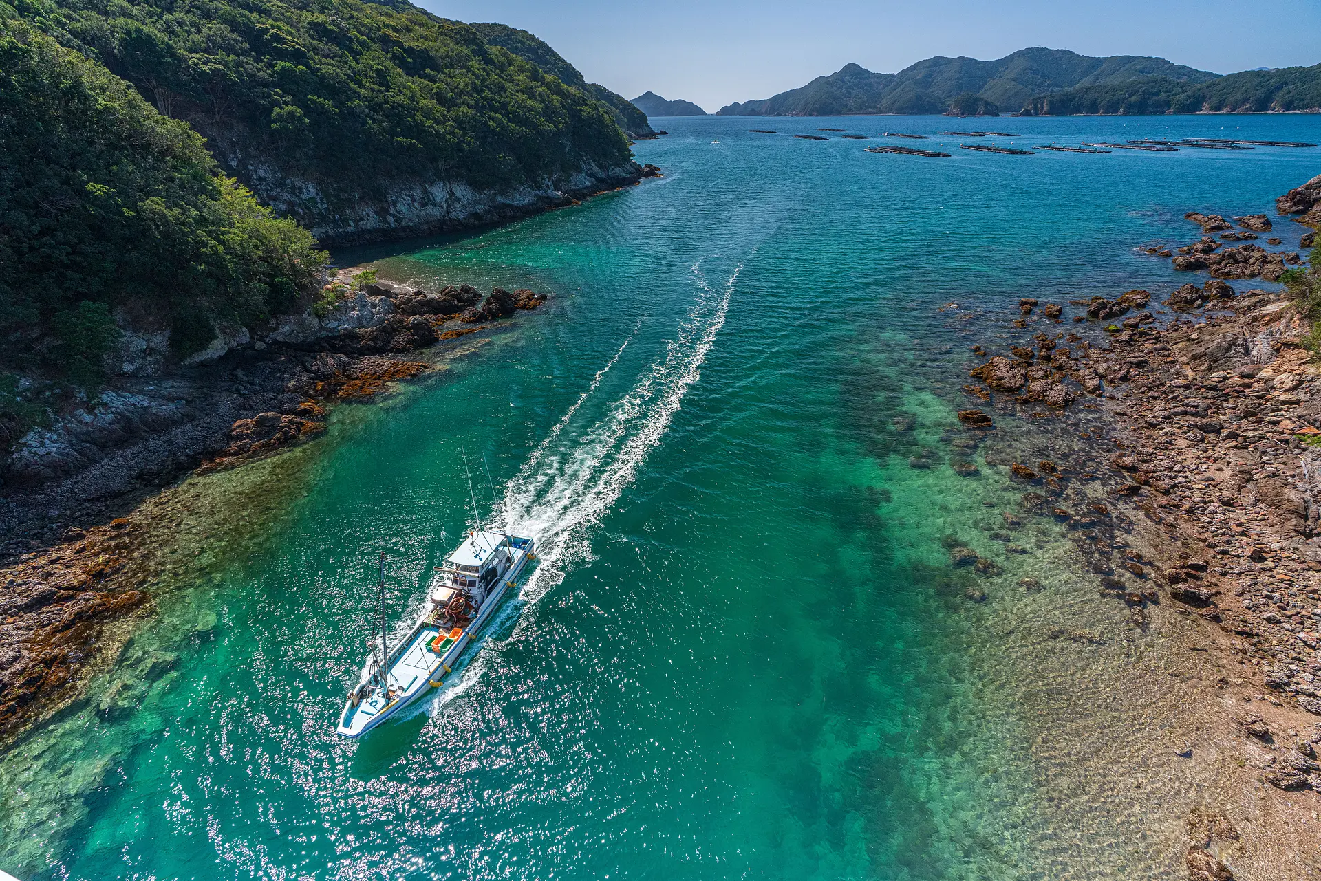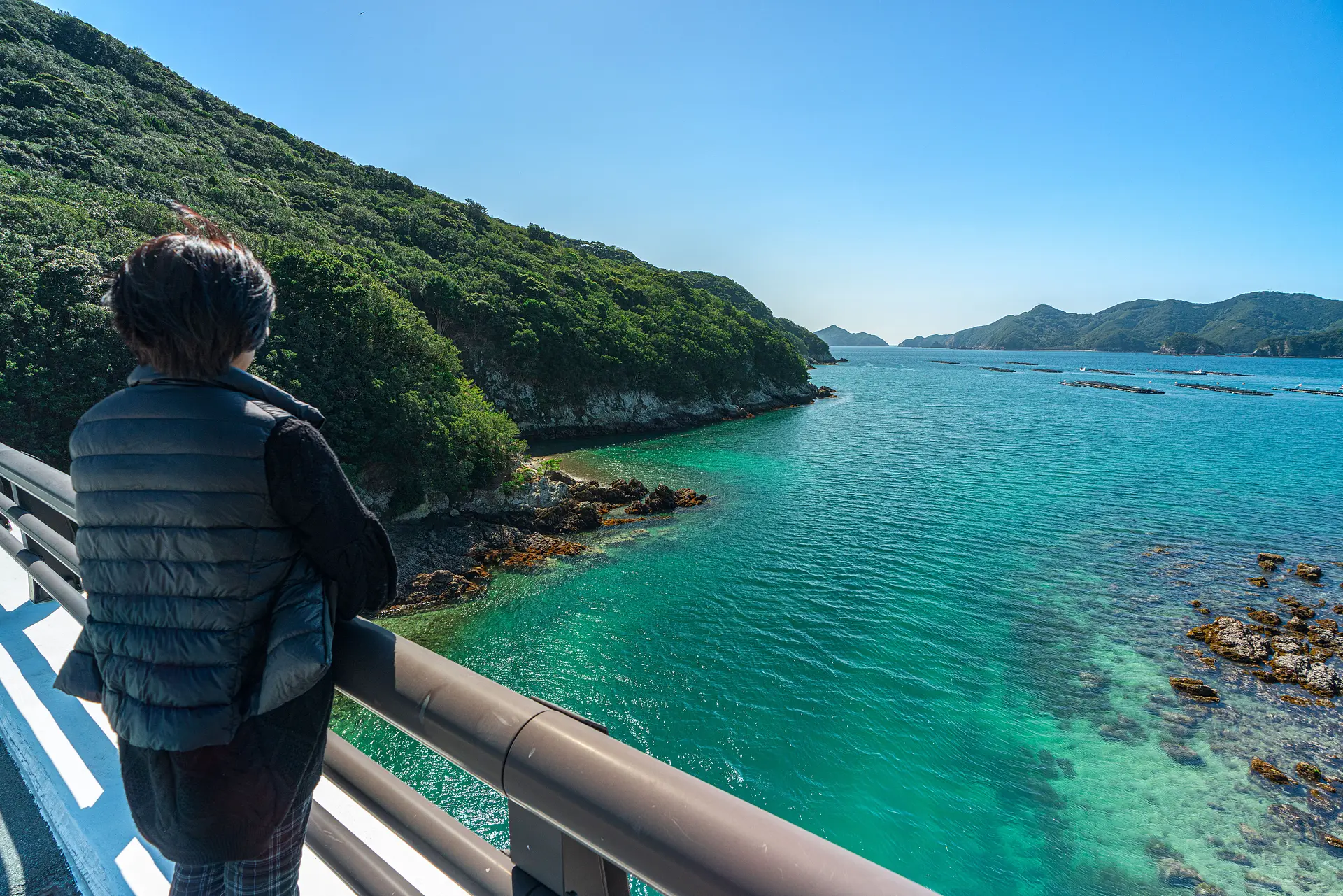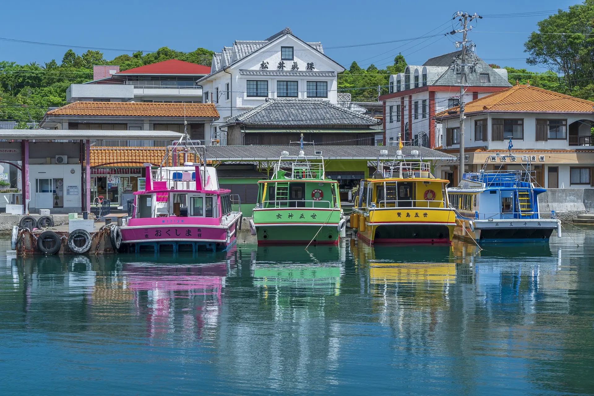 離島のため、移動手段は船になります。あご湾定期船を使うと片道10分で間崎島に到着します。料金は大人380円(中学生以上)、小人190円です(小学生)。あご湾定期船の詳細はこちら