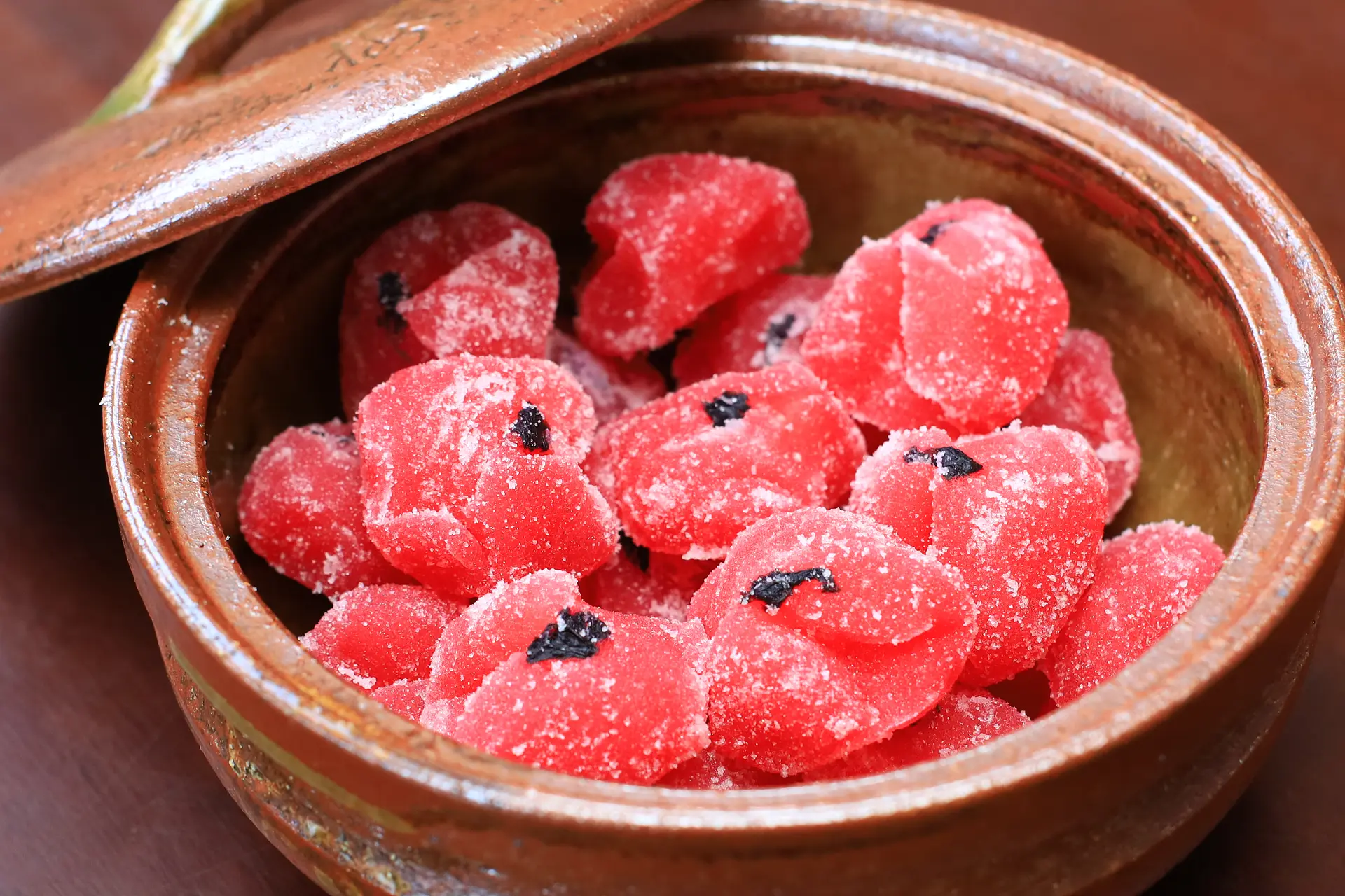 大粒南香梅を羊羹に加え、白餡で包んだ和菓子。皇室をはじめ、様々な団体・企業から好評を得ている大人気商品です。