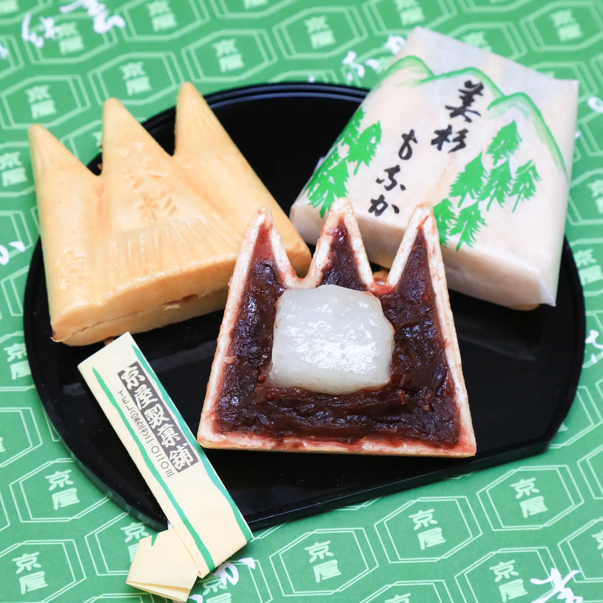 餅と粒あんが入った最中。旧美杉村の村章である三本杉をモチーフにした形になっています。