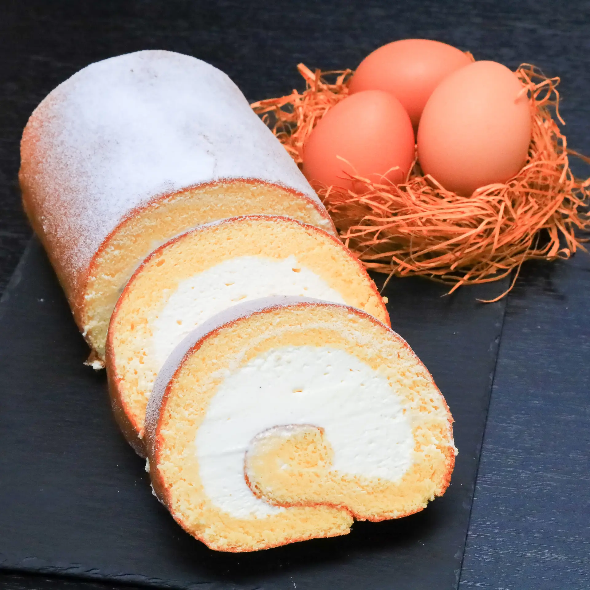 平飼いの有精卵を使用したロールケーキ。コクのあるもっちりとした生地で、ミルキーで優しい味わいのクリームがたっぷり入っています。