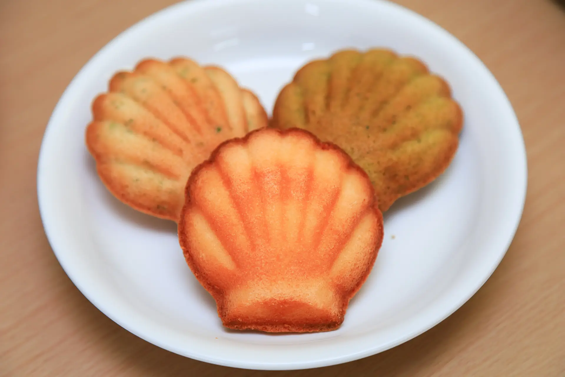 ちゃむ 写真中央がプレーン味、左上があおさ味、右上が伊勢茶味。Blanca 津スイーツファクトリーではいろんな味のシェル・レーヌが販売されていますよ♪