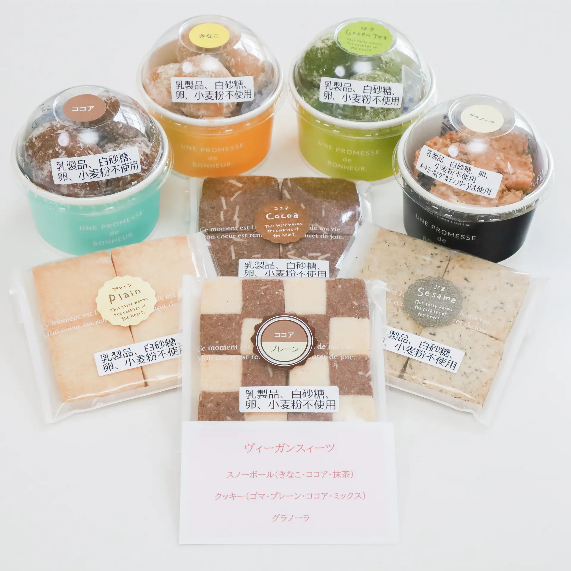 卵・乳製品不使用・グルテンフリーのヴィーガンスイーツを販売するお店です。写真はココナッツオイル・アーモンドプードルを使ったサクサクで美味しい焼菓子です。(予約販売)。